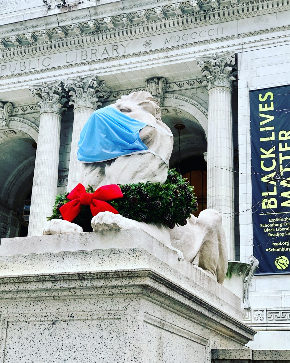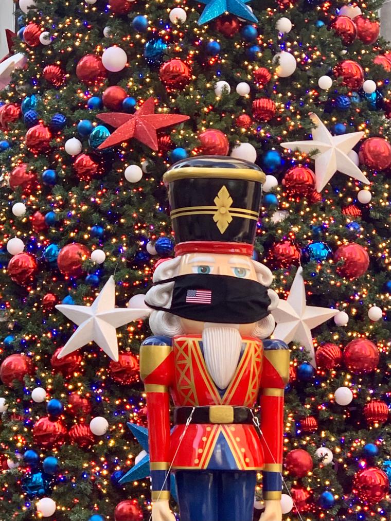 Many holiday displays this year managed to work proper modeling of mask wearing into their offerings, including the New York Public Library lions and this nutcracker on Sixth Avenue.