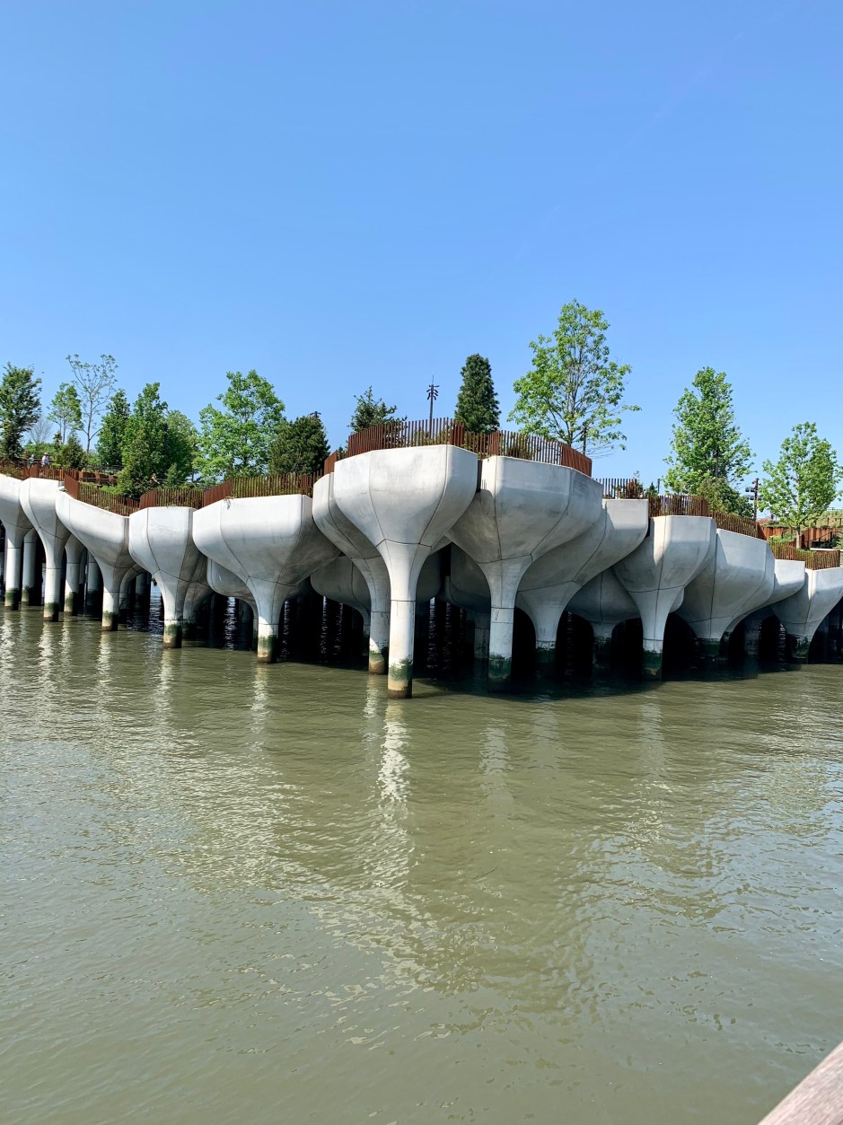 During New York City’s lockdown due to the Covid-19 pandemic in 2020, I took up bike riding, primarily along the Hudson River Greenway (see more detail about my perspective on biking in NYC here). Although I had previously noticed the odd constellation of what looked like concrete mushrooms blooming in the Hudson River just south of Chelsea Piers at Pier 55, on my nearly-daily rides past the construction area I watched with interest the development of the city’s newest park. I was thrilled to visit Little Island Park on its first day open to the public, May 21, have been back recently, and have another visit booked (more on the need to book timed tickets later).