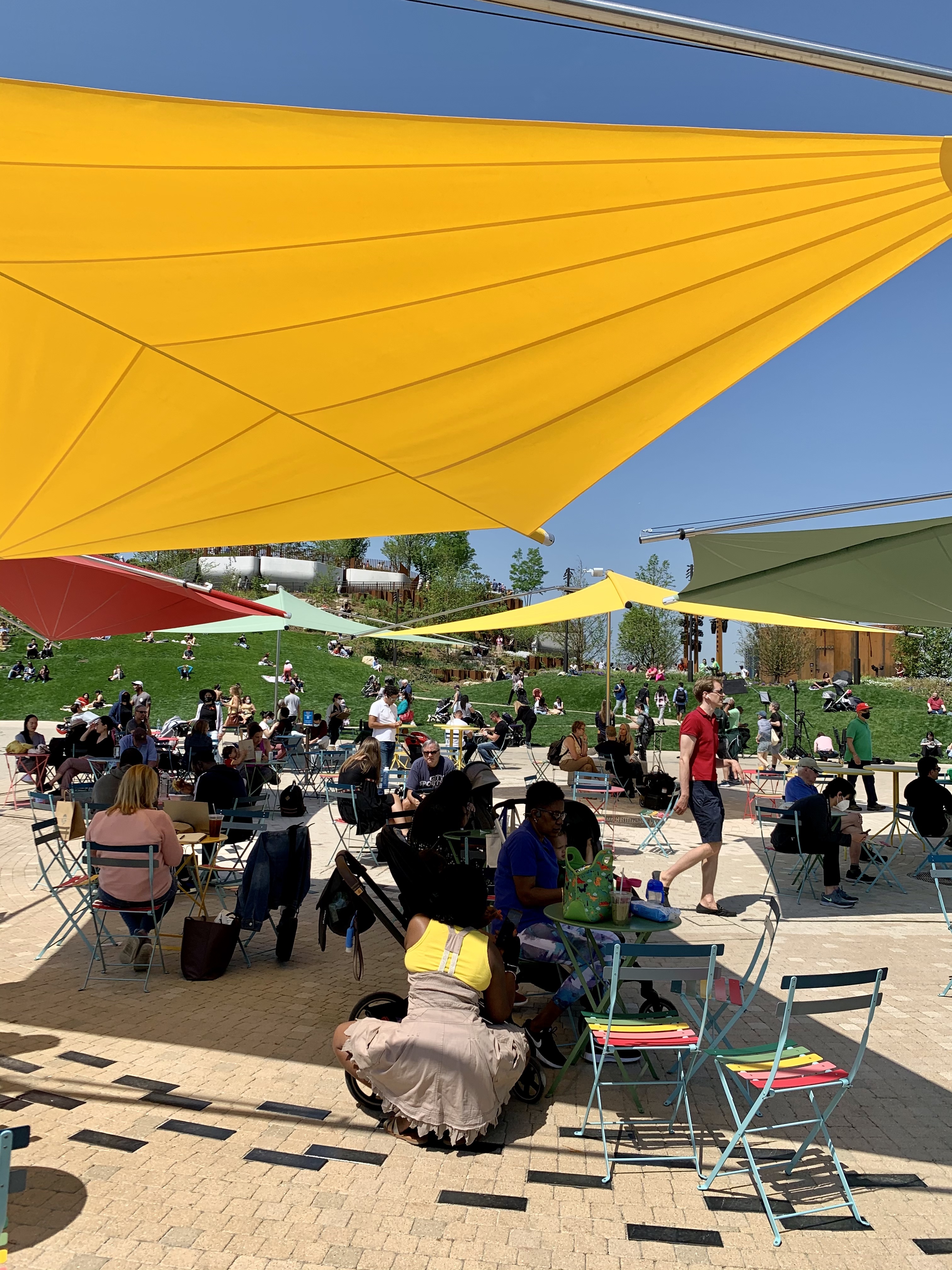 Enter where 13th Street meets the Hudson River, walking over a bridge to get to this park built over the water. One of the first things you see is a series of food trucks with an area to eat in the shade. There are a variety of wines, beers, and cocktails available in addition to food, coffee, pastries, and non-alcoholic beverages.