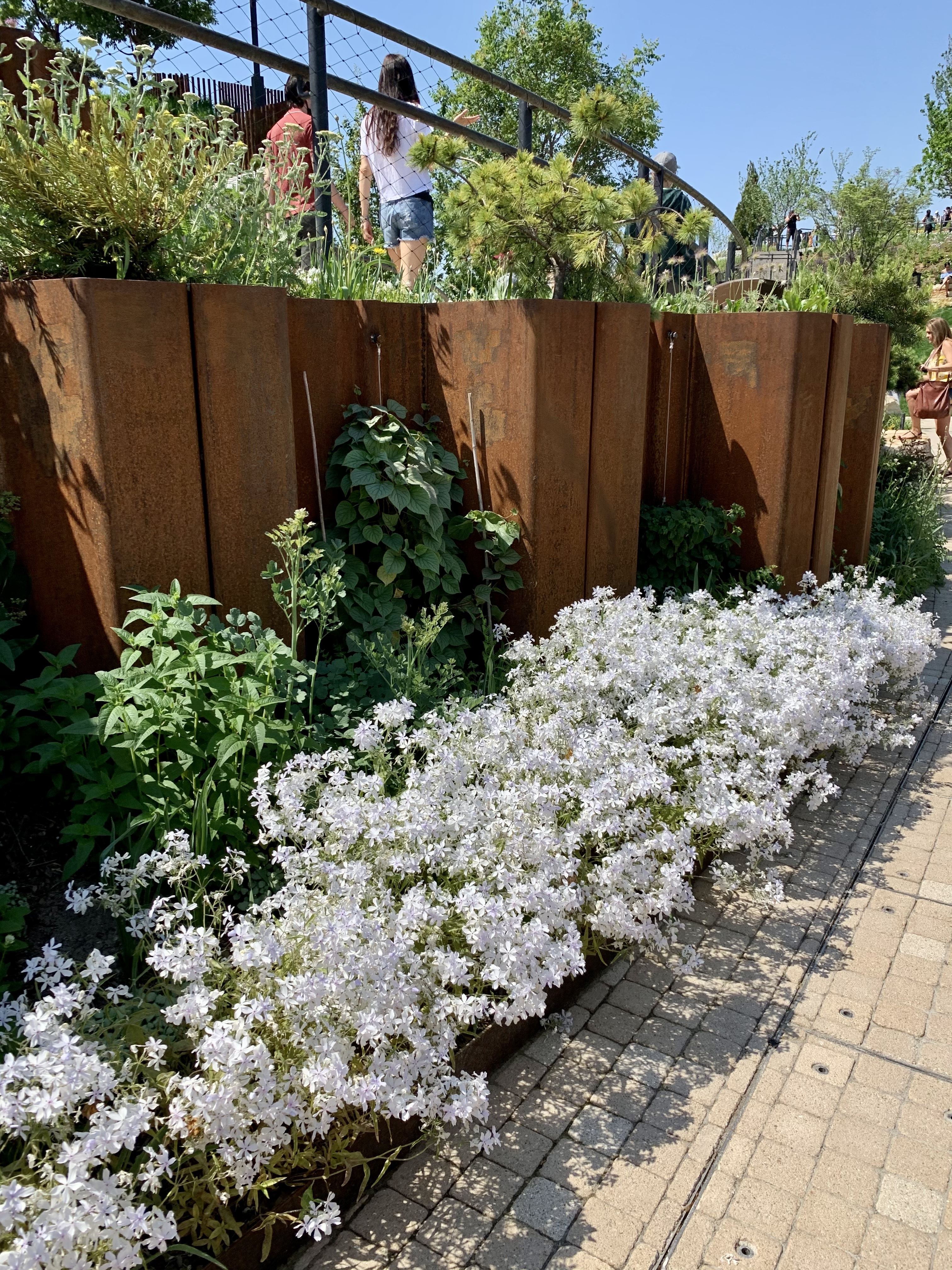 Flowers and other lush landscaping bloom atop the concrete petals. Once in the park, you barely notice the structure that is so striking from a distance – unless you happen to be walking under a few of them, as the park has many different elevations.