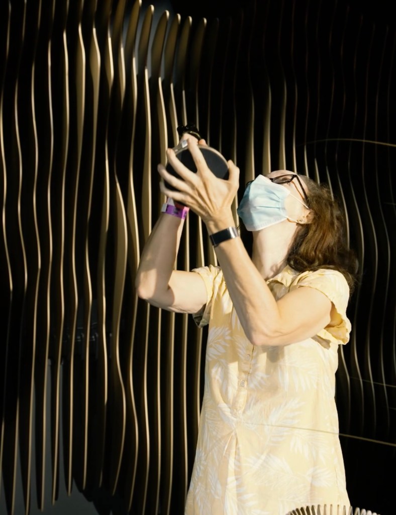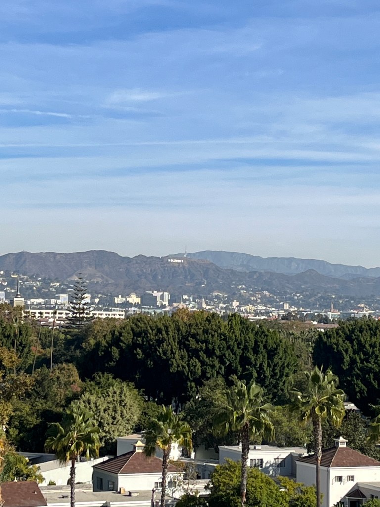 We are still dealing with Covid, the first step was to show proof of vaccination and get a wristband showing you had been checked. Masks are required at all times as well. Then another check in to prove the timed tickets and get a second wristband to allow access to the areas of the museum beyond the ground floor, which is free to enter. The outside of the museum is gorgeous, the site of an old department store in a classic mid-century LA style. Behind it, a fabulous new annex holds theatres as well as an outdoor domed space with panoramic views of the Hollywood Hills – including the sign. To avoid having others in my photos, I went straight up to this level at museum opening.