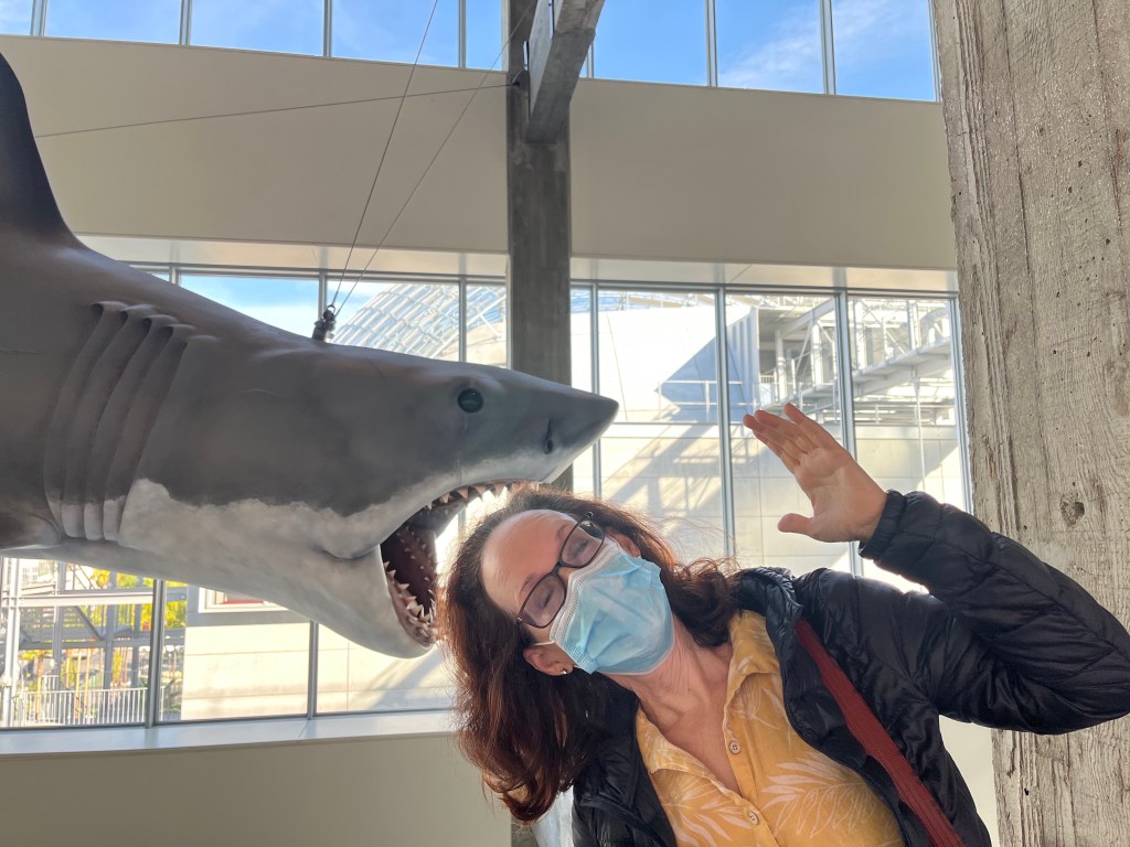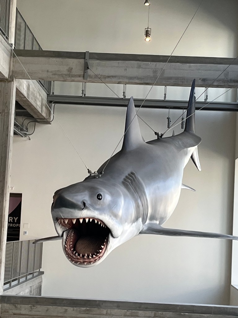 Hanging from above, a model of “Bruce,” the shark from Jaws . . .