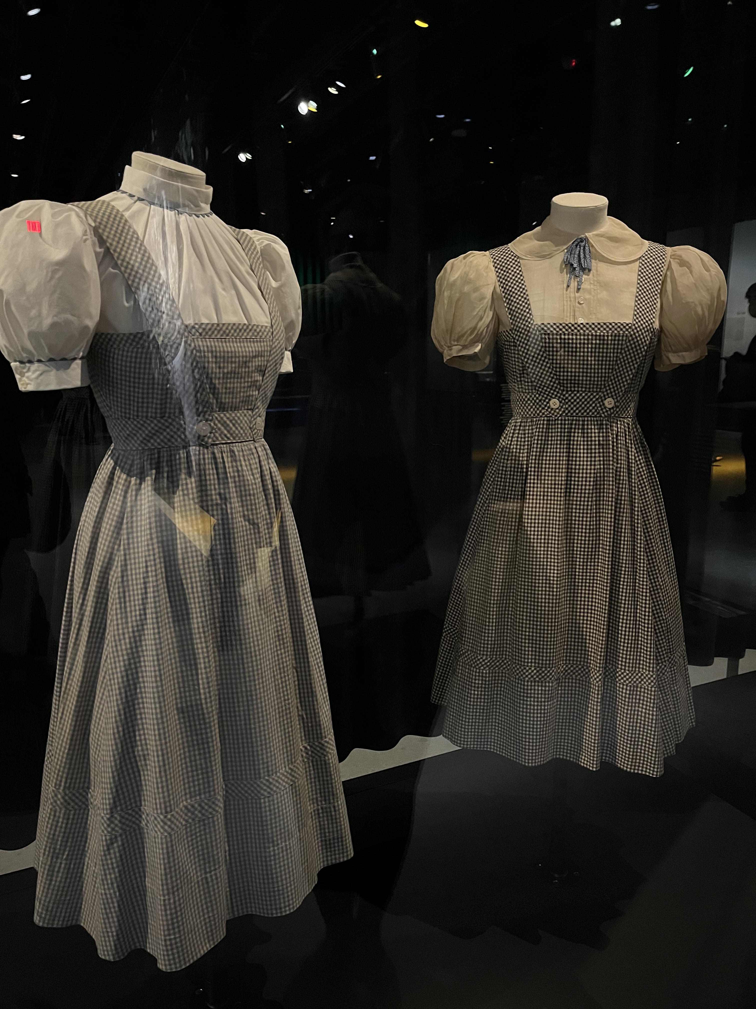 The two gingham dresses, one in sepia tone and one in color, were used for the scene where Dorothy transitions from the real world, in sepia, to Oz, in color. Shot in one continuous scene, a stand in for Garland wore the sepia dress, was shown from behind, and opened the door. At that point Garland, wearing the blue dress, stepped into colorful Oz.