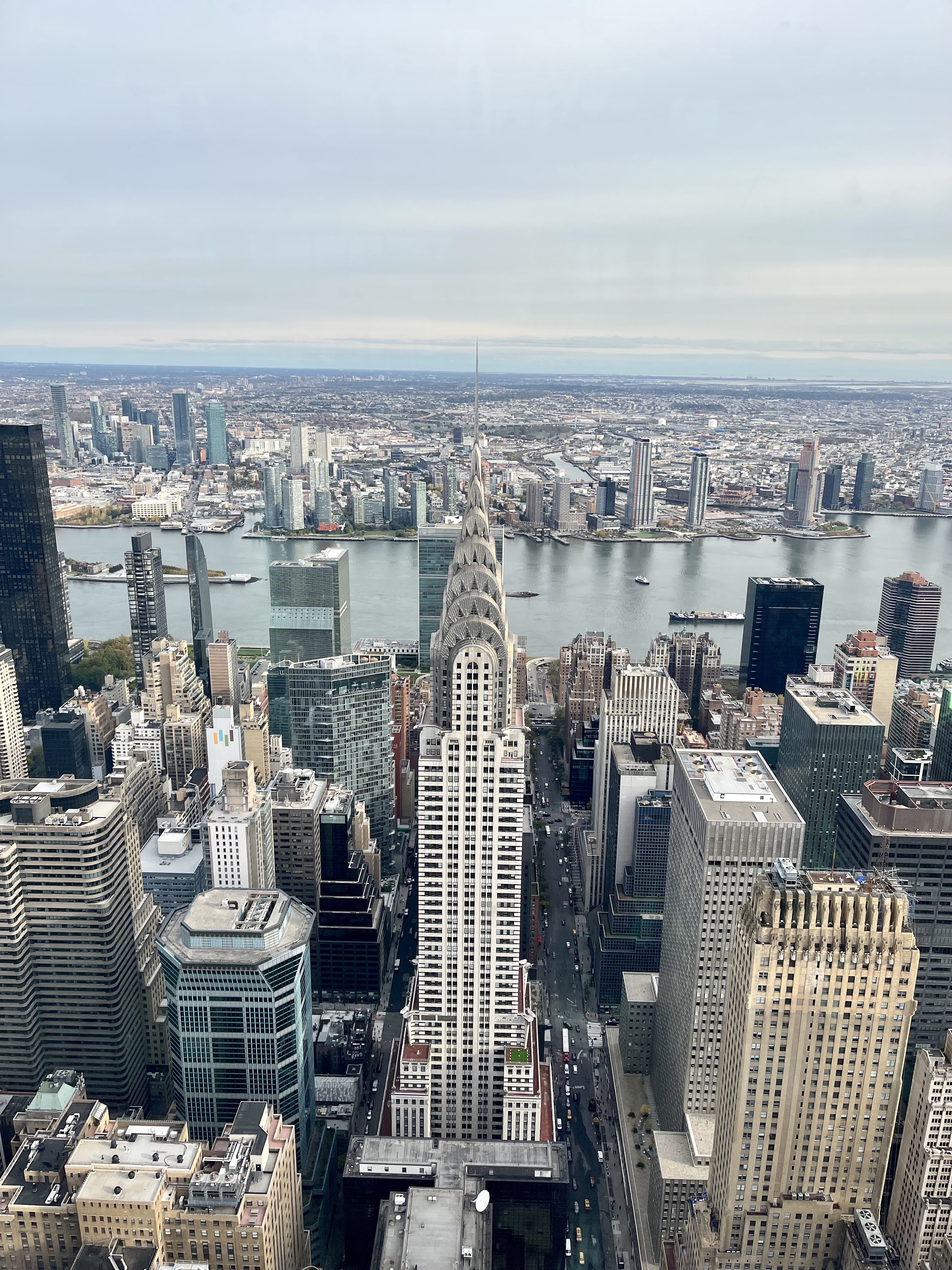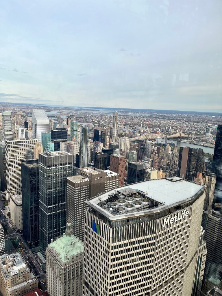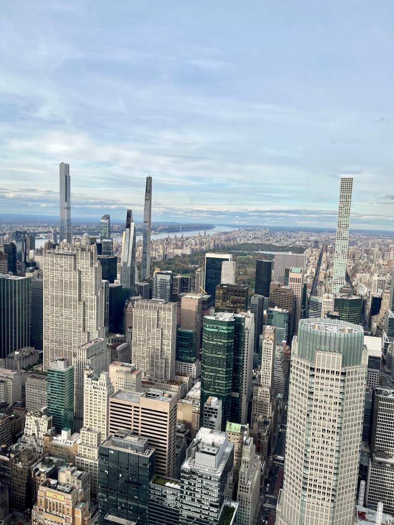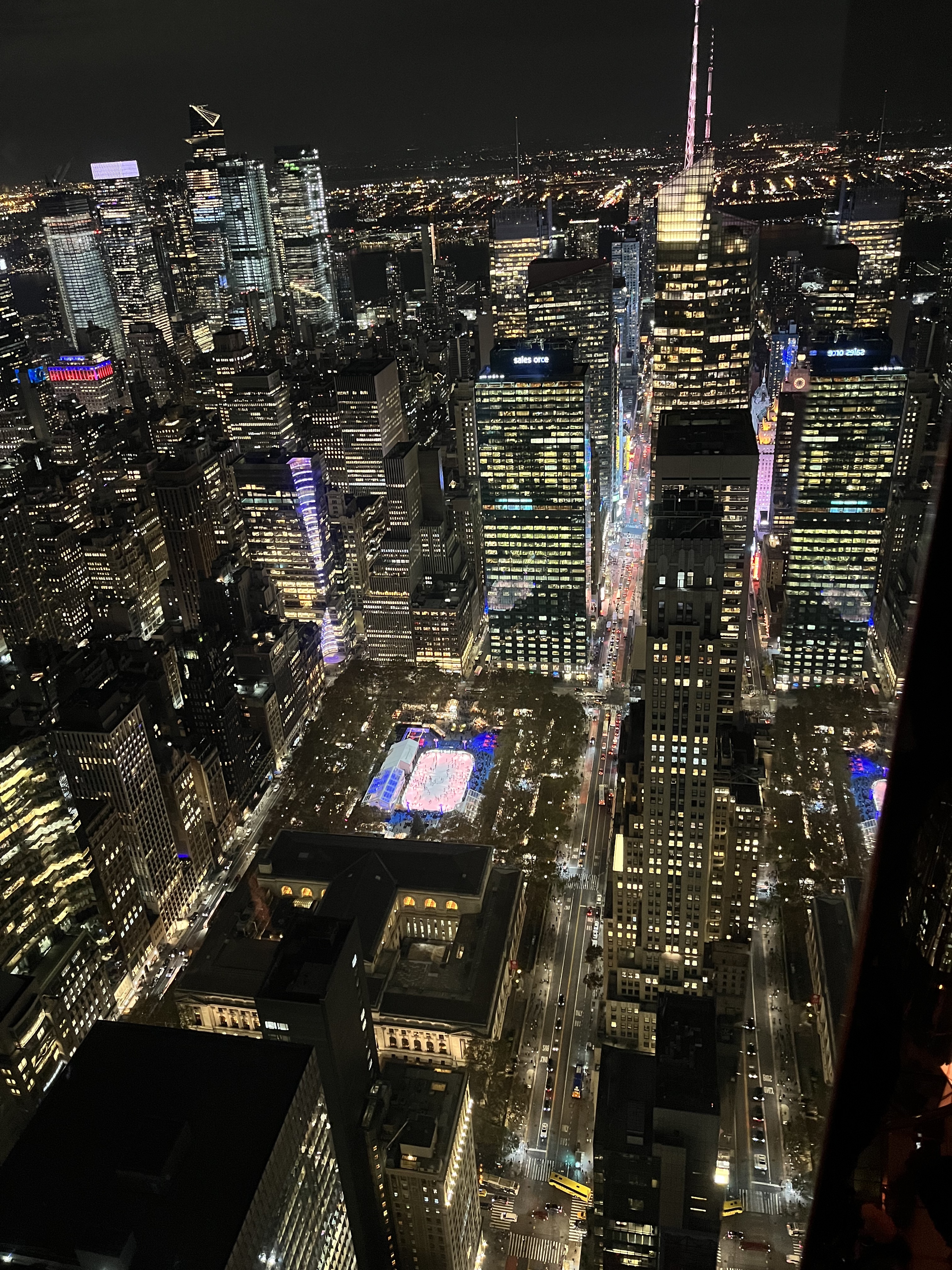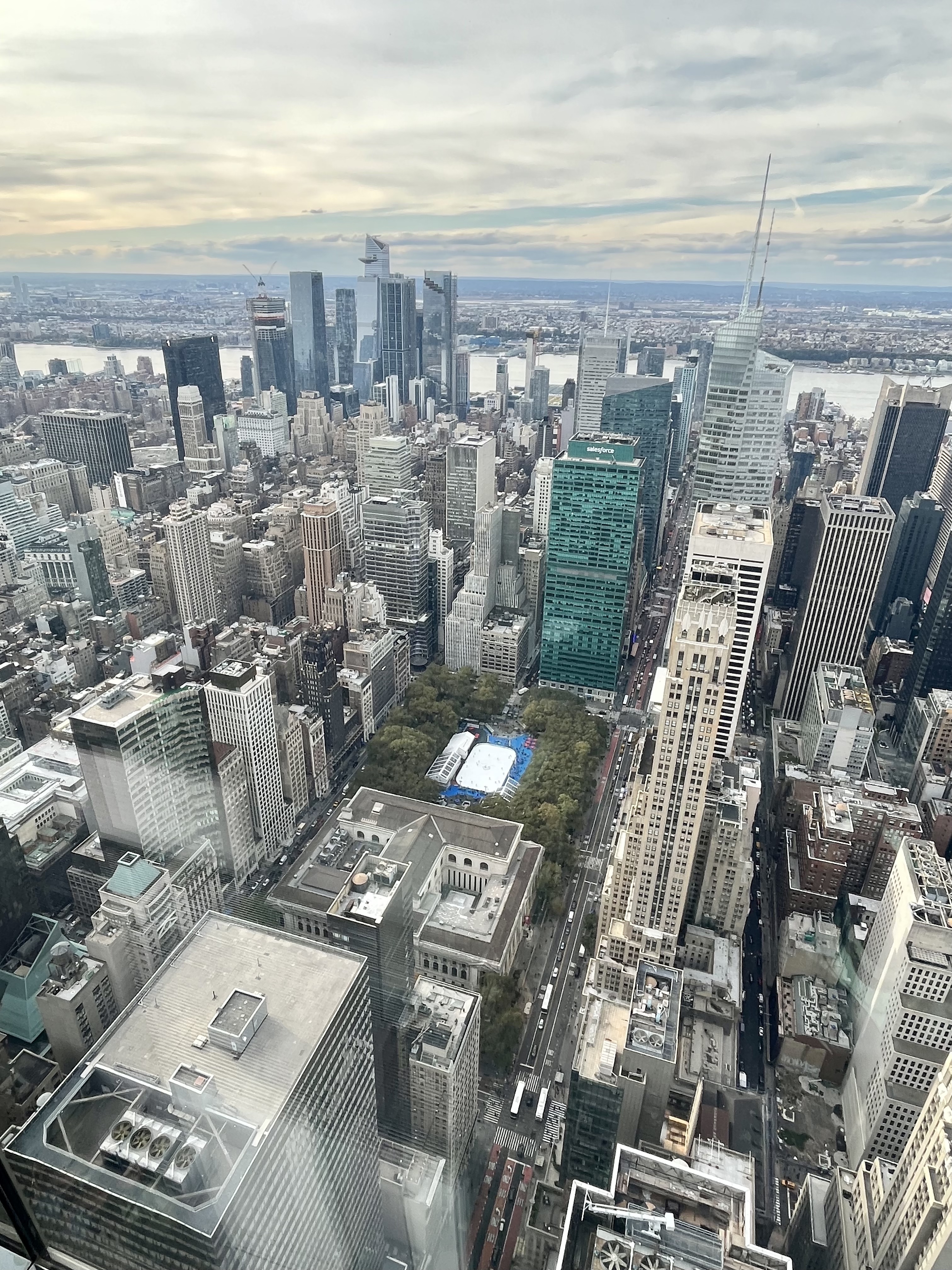 And what can you see? First is a picture-perfect view of the Empire State Building to the south, and much farther south, One World Trade at a distance. To the east, you look DOWN (a bit disconcerting!) onto the Chrysler Building, and to the west you can look down onto the New York Public Library and the skating rink in Bryant Park, over Times Square, and toward Hudson Yards. To the north, you see Central Park and the super-talls on Billionaire’s Row. You can see the Statue of Liberty, and every bridge, from the Verrazzano-Narrows to the George Washington.