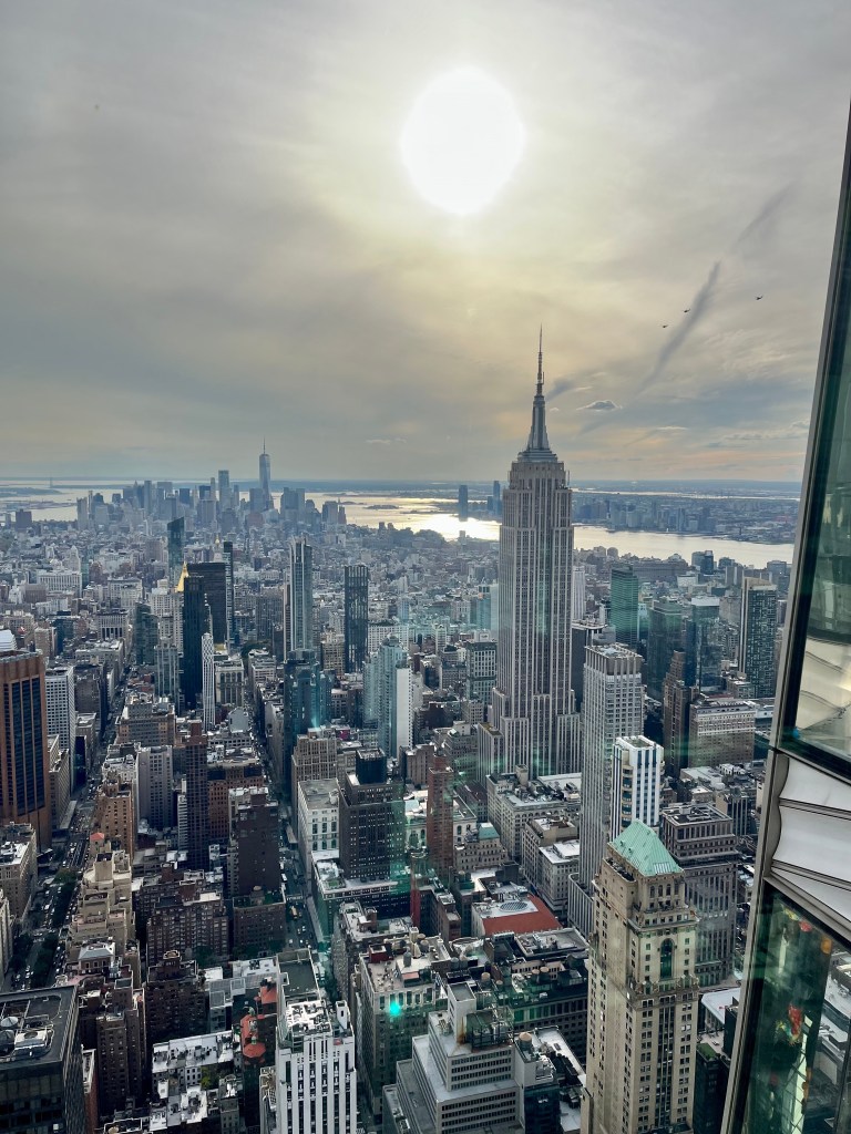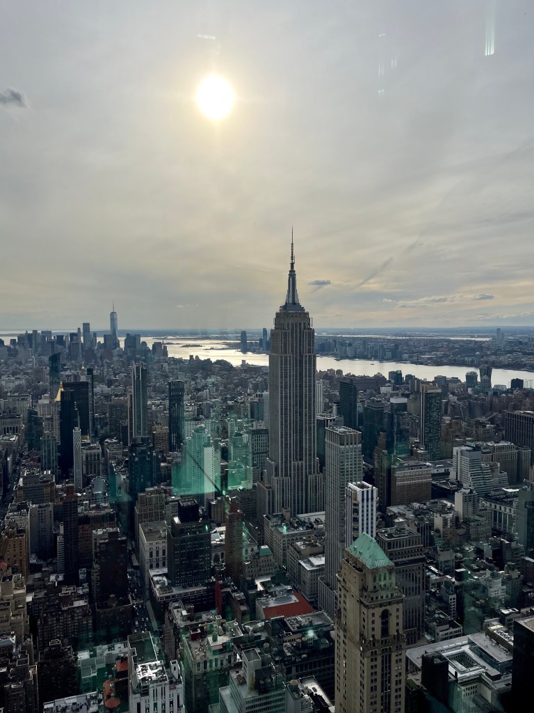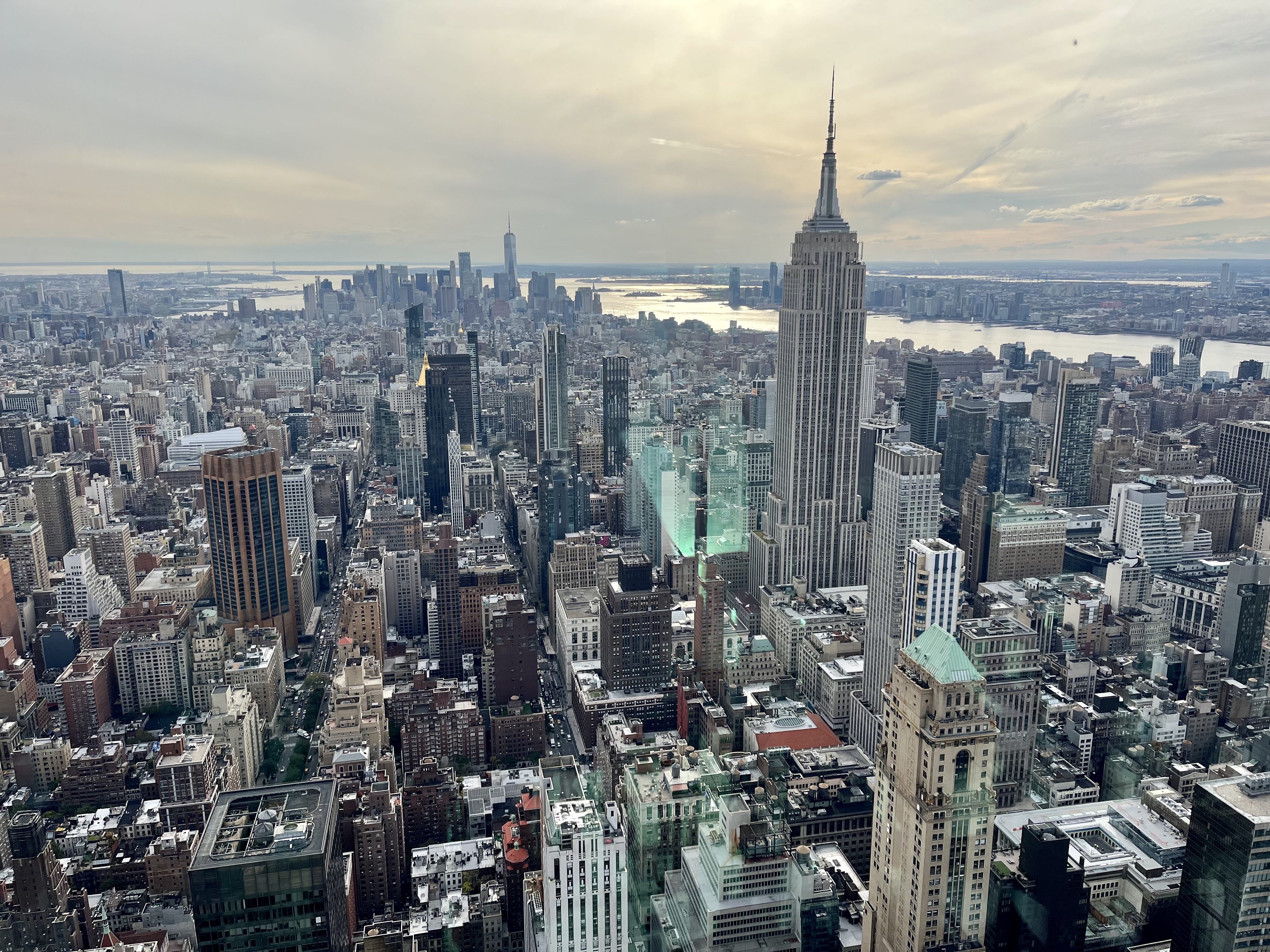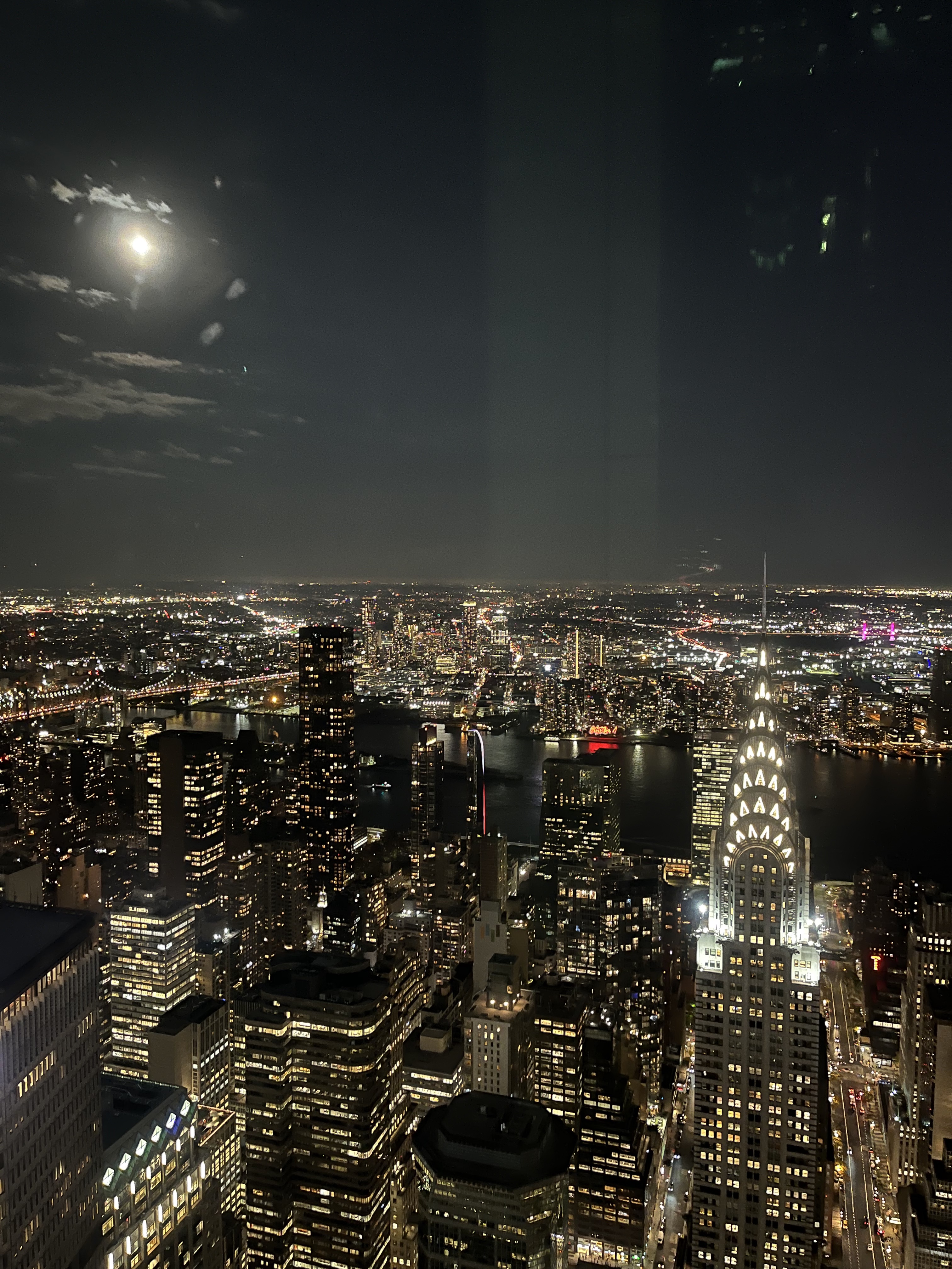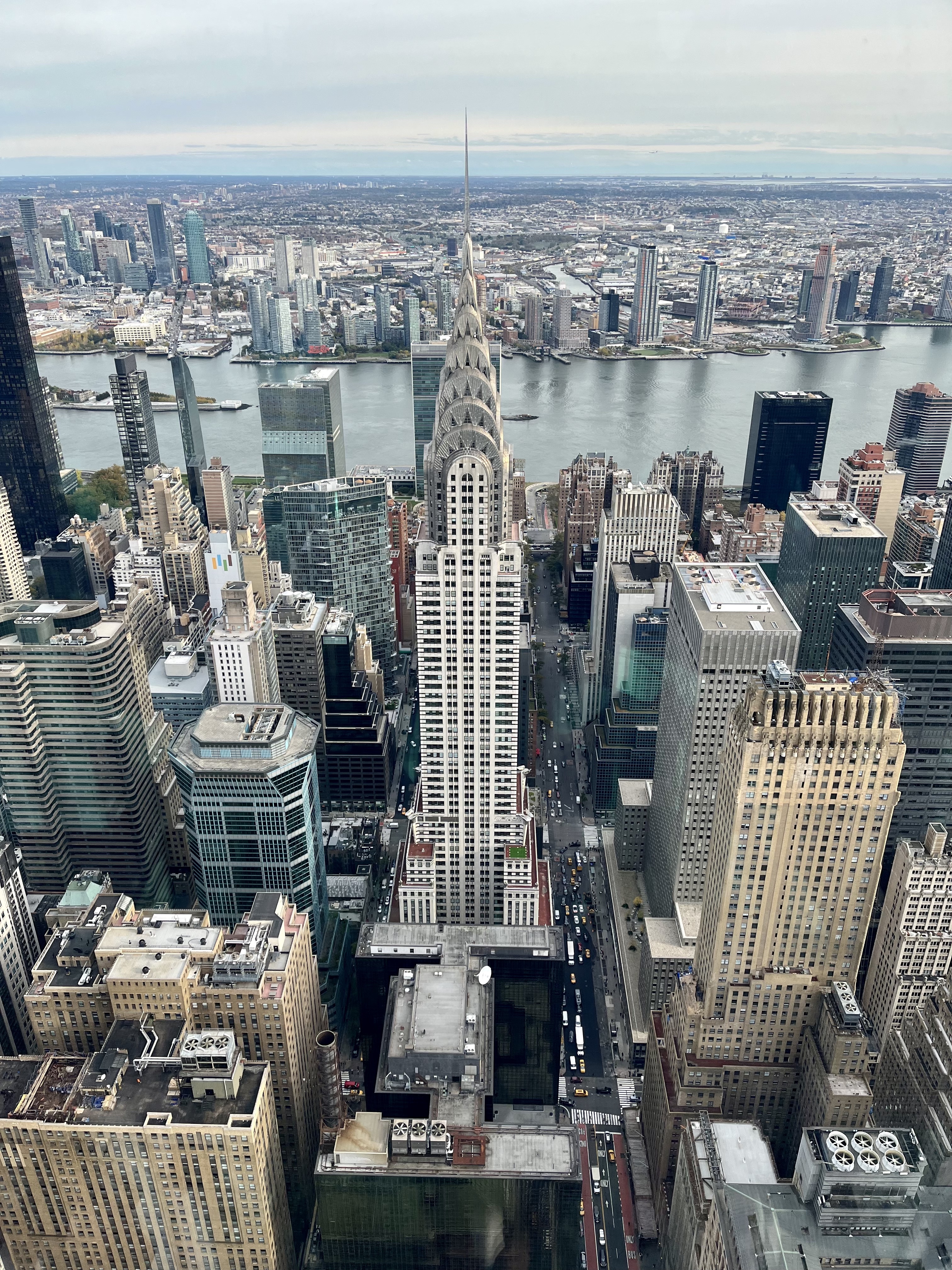 And what can you see? First is a picture-perfect view of the Empire State Building to the south, and much farther south, One World Trade at a distance. To the east, you look DOWN (a bit disconcerting!) onto the Chrysler Building, and to the west you can look down onto the New York Public Library and the skating rink in Bryant Park, over Times Square, and toward Hudson Yards. To the north, you see Central Park and the super-talls on Billionaire’s Row. You can see the Statue of Liberty, and every bridge, from the Verrazzano-Narrows to the George Washington.
