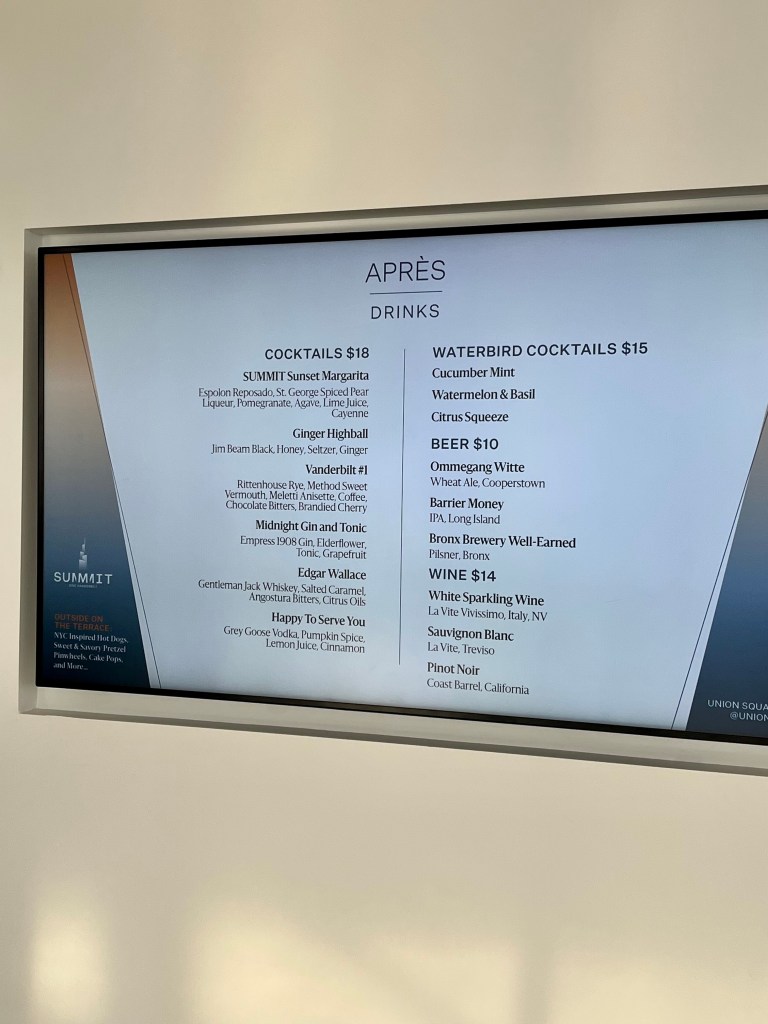 But what of the Ascent elevator? See above, for an extra price, you can stand in a clear glass elevator perched on the side of One Vanderbilt, go up even higher, have 90 seconds to take photos, and come back down. There is an enhanced ticket that you can get that includes the experience, the Ascent elevator, and a Danny Meyer cocktail (menu seen in a photo collage above). Did I enjoy the cocktail (I got the margarita) – of course, it was delicious! But do I think you necessarily need to pay for the Ascent plus cocktail to enjoy yourself? No – if you need to save a little money, just do Summit without any add-ons. Speaking of cost, tickets cost more at night than during daylight, with an extra surcharge for sunset times. There is a $5 per ticket discount for NYC residents. Find out more here.