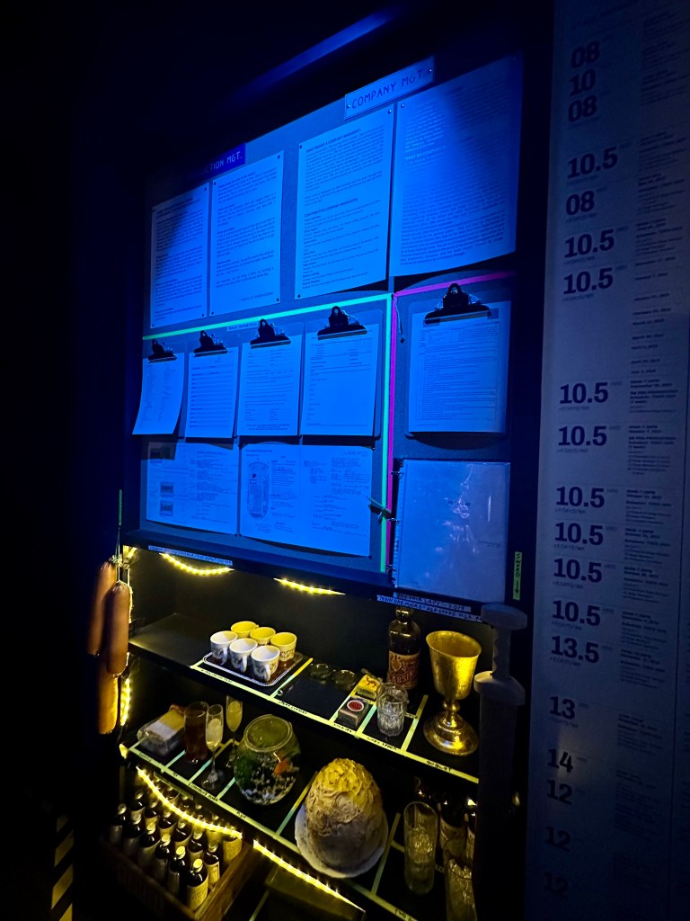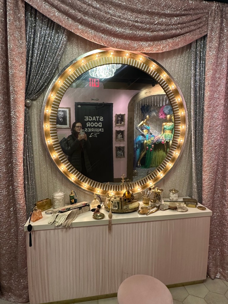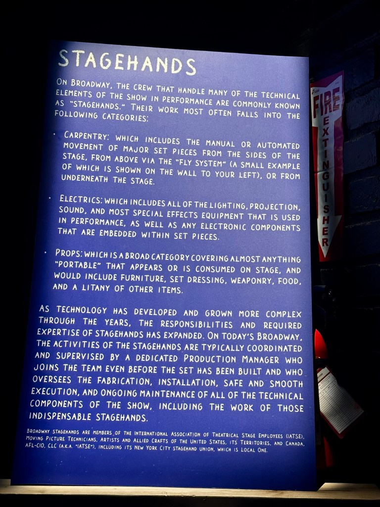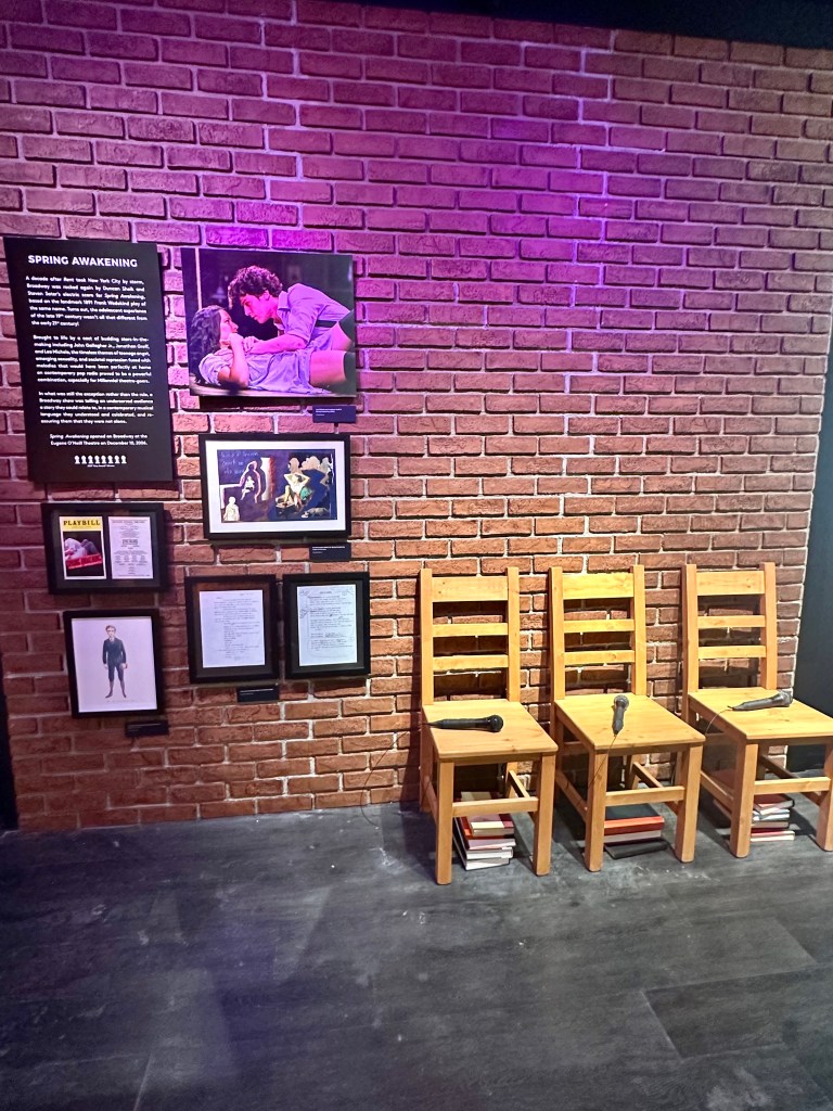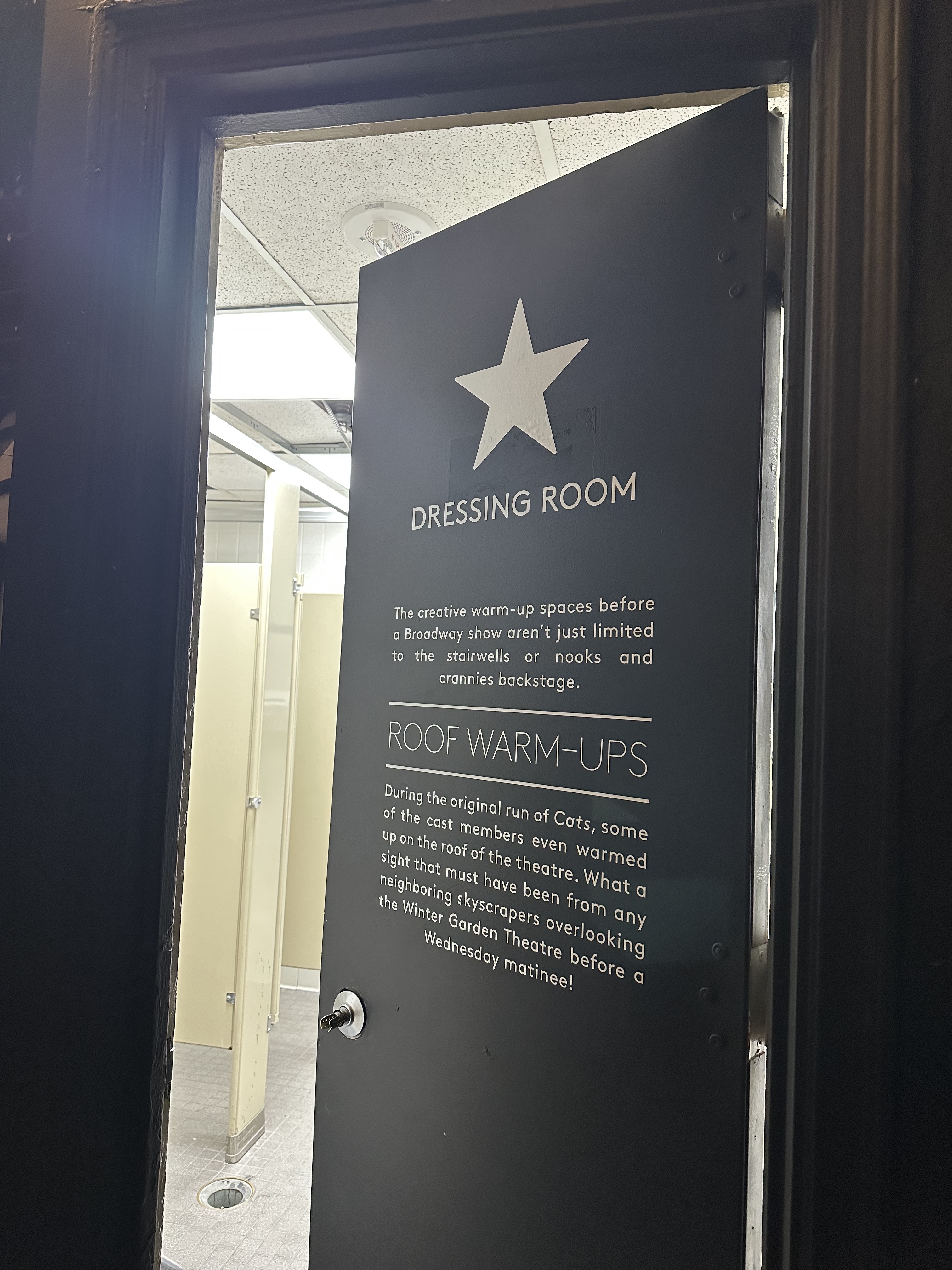 Everything is completely themed – so when you are entering through a stairwell, you see information about warmups in stairwells before a show, backstage traditions, and even the bathrooms are disguised as dressing rooms.