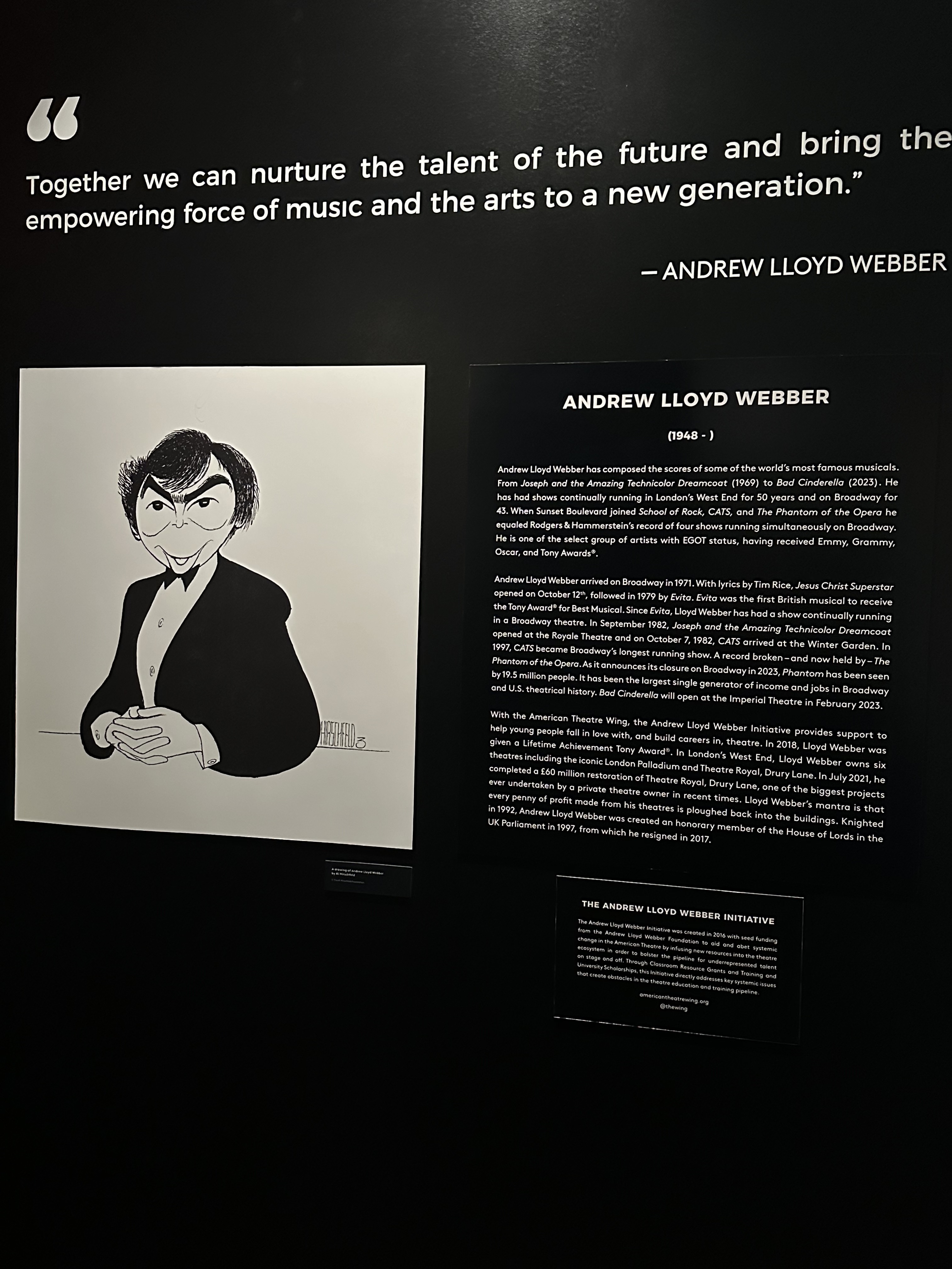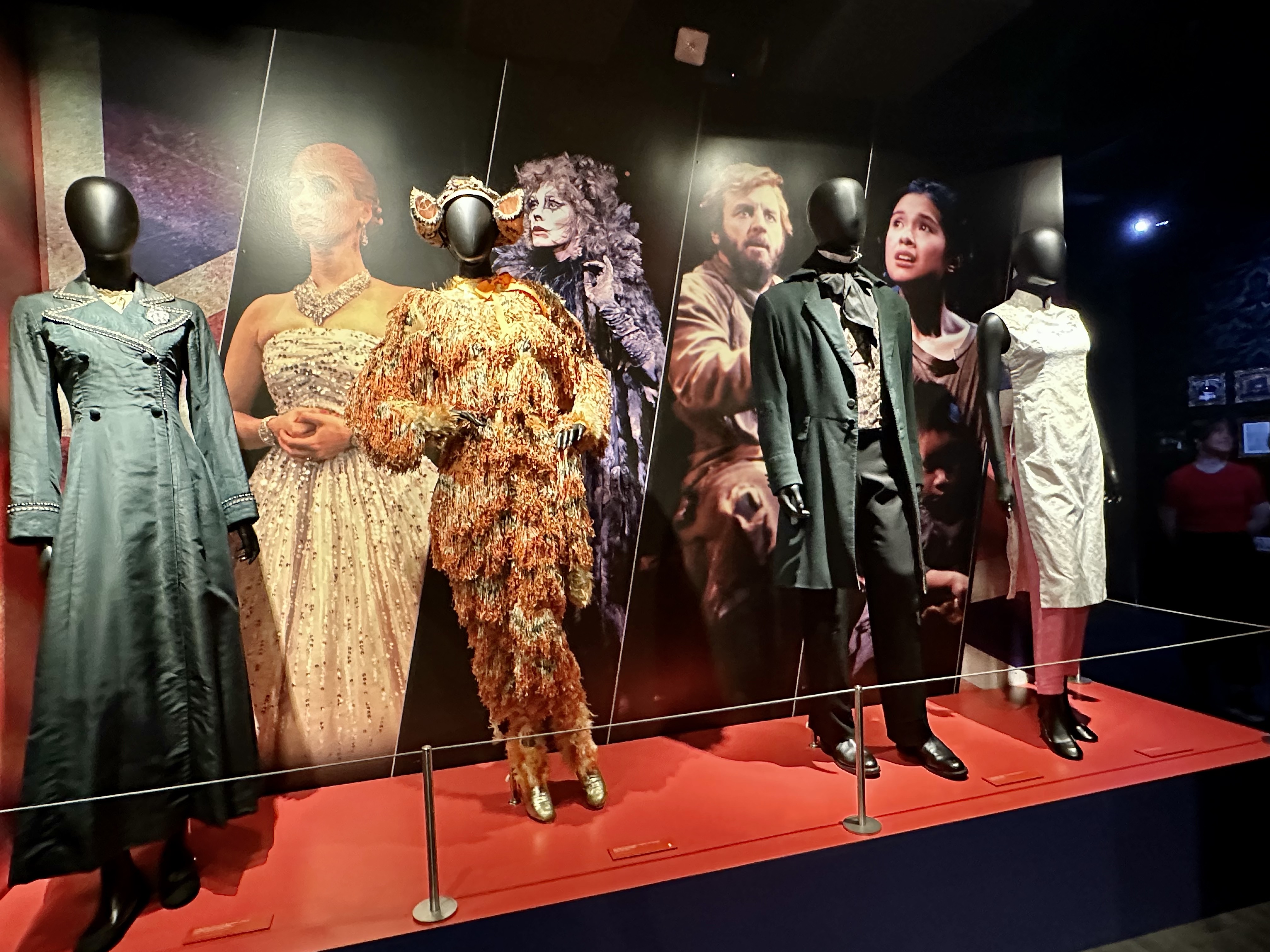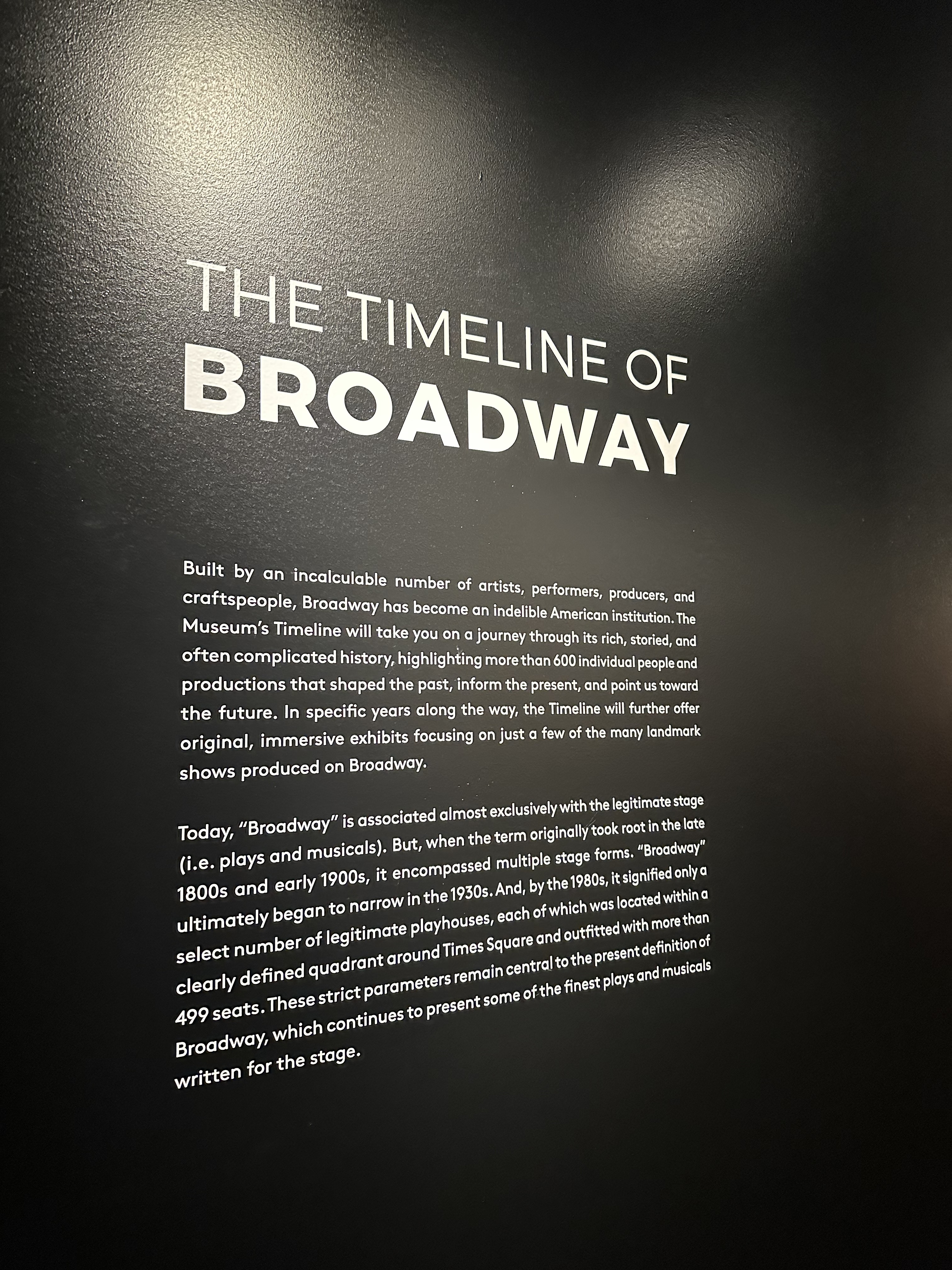 There have always been good exhibits about Broadway theatre around the city that come and go. The Performing Arts Library has excellent displays – some more elaborate, like the Hal Prince exhibit a few years ago, and some as quick pop-ups like the one honoring Stephen Sondheim via his correspondence set up after his death almost a year ago. There was a terrific temporary exhibit about costumes around the time Broadway reopened after pandemic. And many theatres themselves have displays of old show art or even props or costumes from productions that have been in that theatre. But when I heard people were planning to create a permanent Museum of Broadway, I thought that was a splendid idea and knew I wanted to be there as soon as they opened. I was fortunate enough to be there on opening day, and thoroughly enjoyed myself.