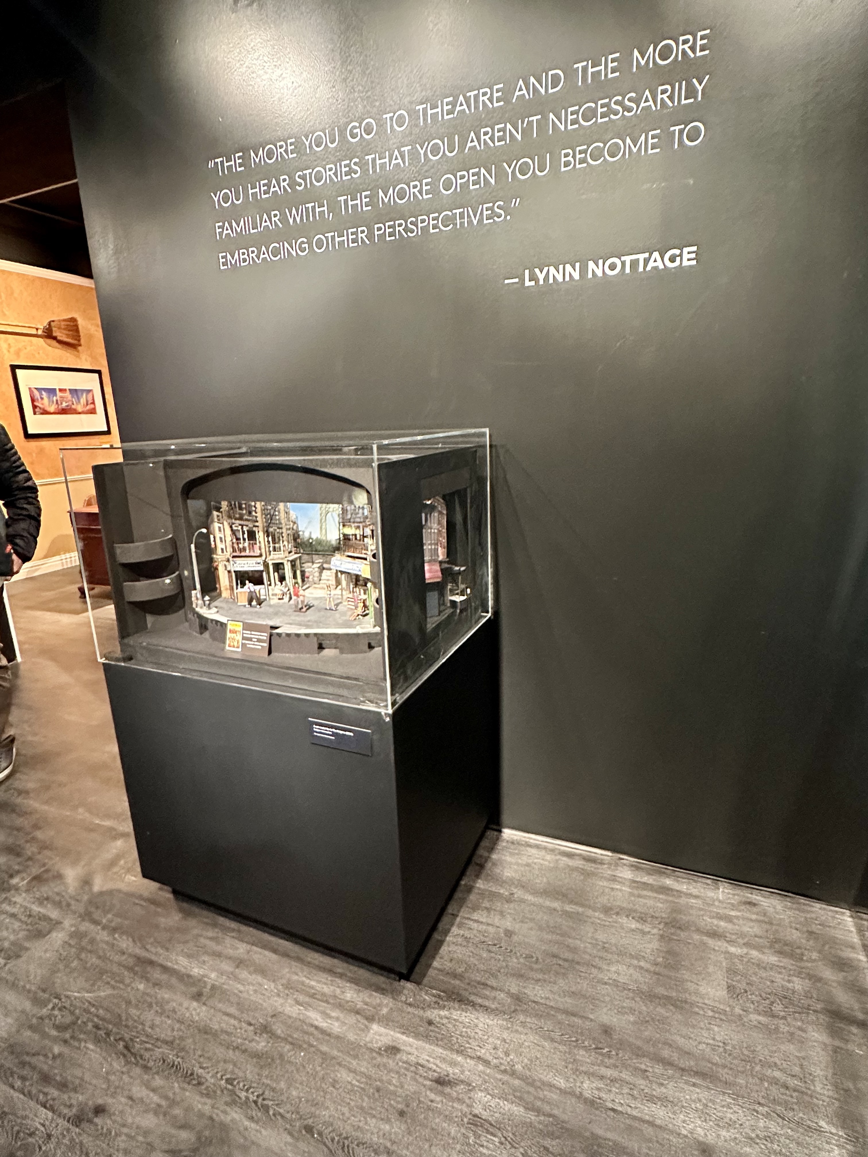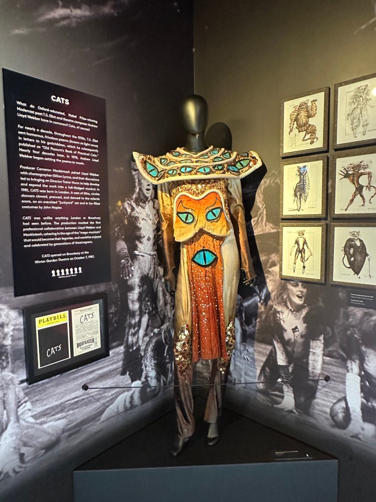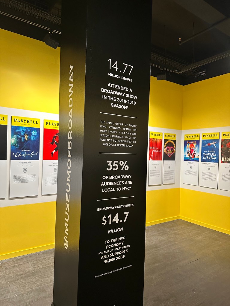 There have always been good exhibits about Broadway theatre around the city that come and go. The Performing Arts Library has excellent displays – some more elaborate, like the Hal Prince exhibit a few years ago, and some as quick pop-ups like the one honoring Stephen Sondheim via his correspondence set up after his death almost a year ago. There was a terrific temporary exhibit about costumes around the time Broadway reopened after pandemic. And many theatres themselves have displays of old show art or even props or costumes from productions that have been in that theatre. But when I heard people were planning to create a permanent Museum of Broadway, I thought that was a splendid idea and knew I wanted to be there as soon as they opened. I was fortunate enough to be there on opening day, and thoroughly enjoyed myself.