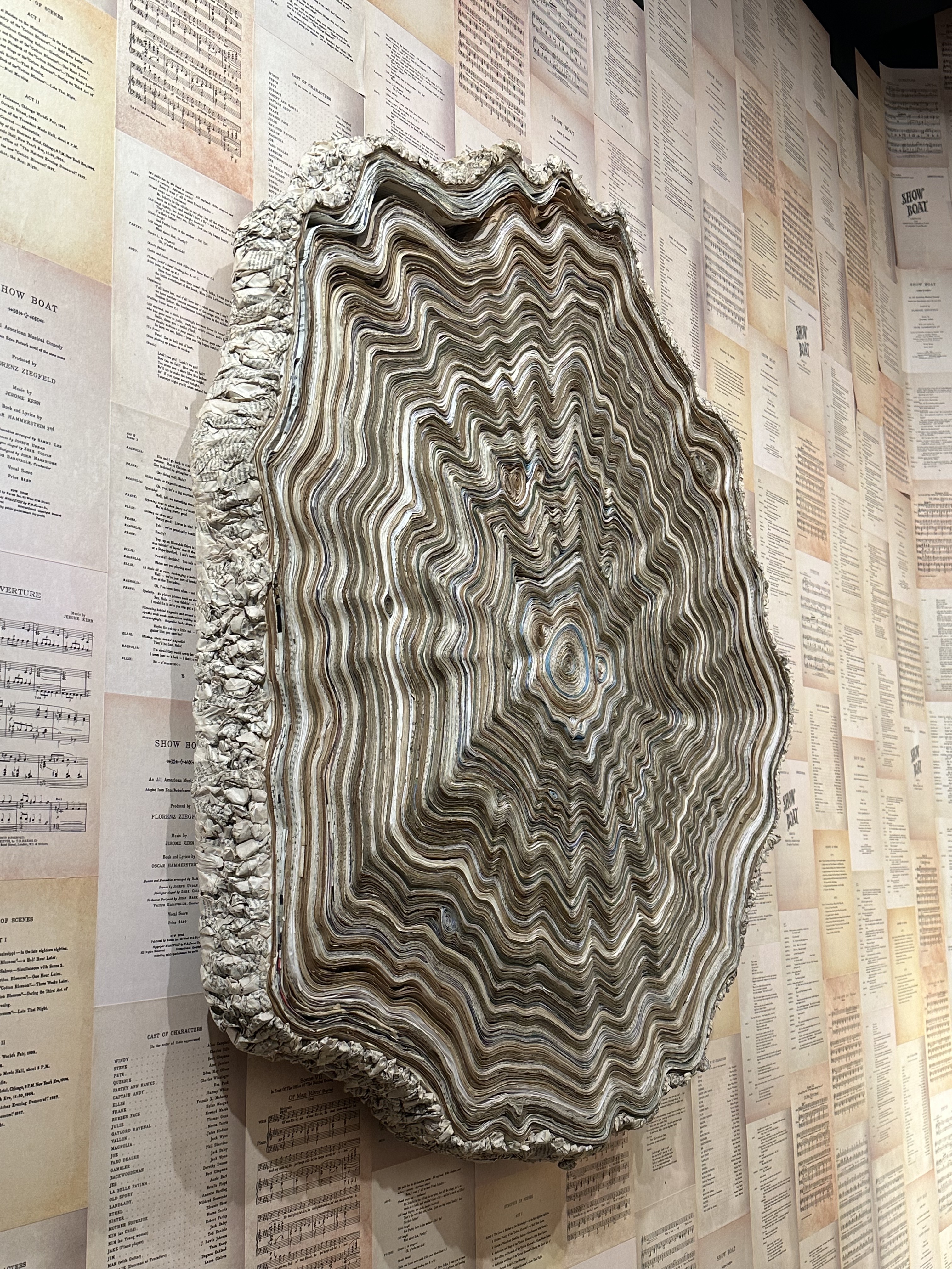 The next section featured Show Boat, often considered to be the first true musical theatre piece (rather than a revue). The cross section is of a tree trunk showing the time between 1927 when Show Boat first was produced, and 2022, the opening of the Museum of Broadway