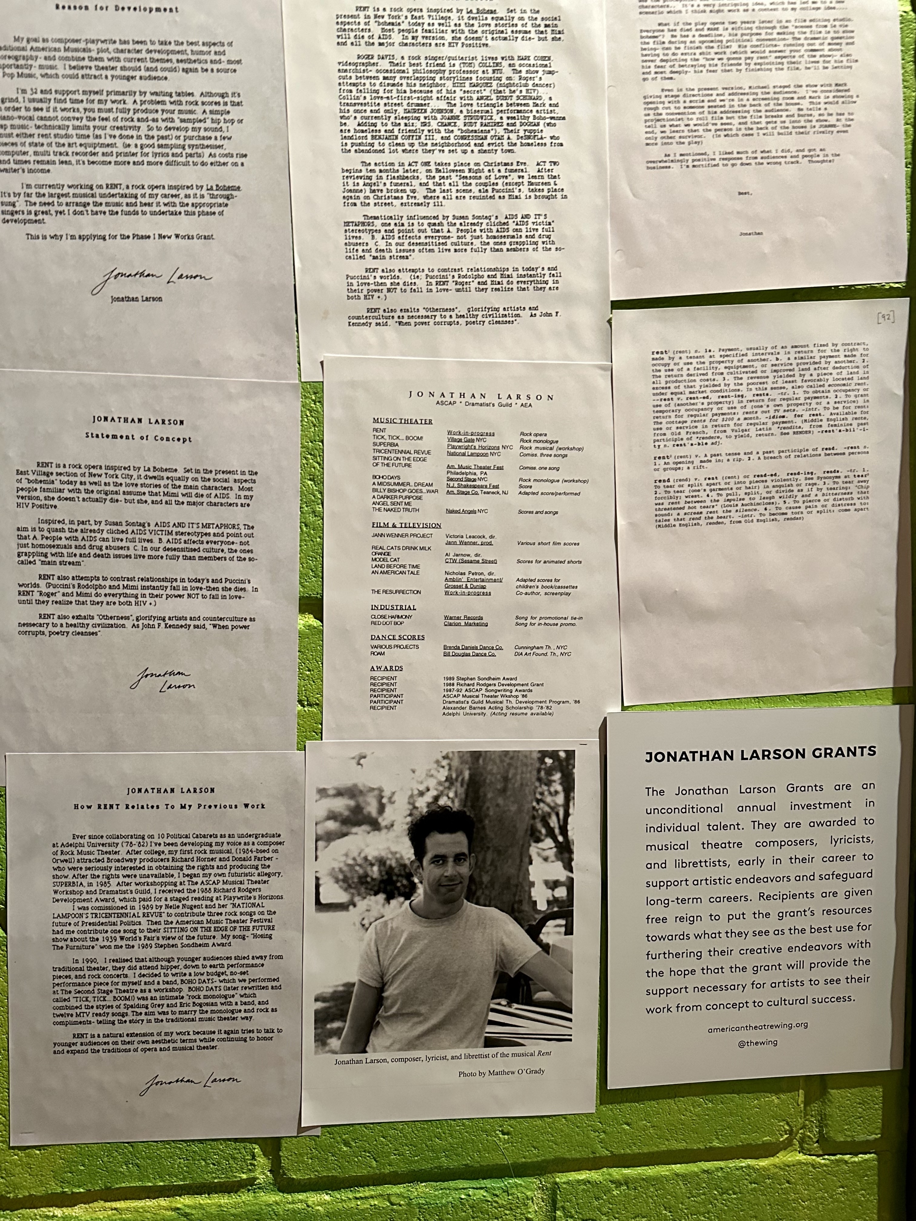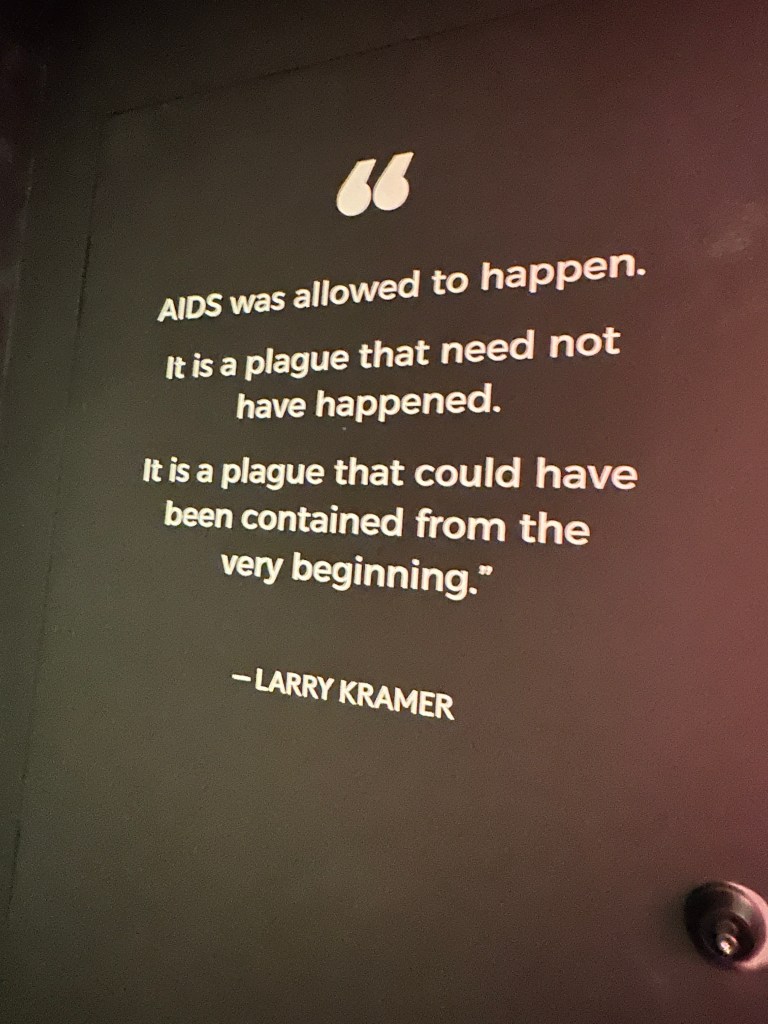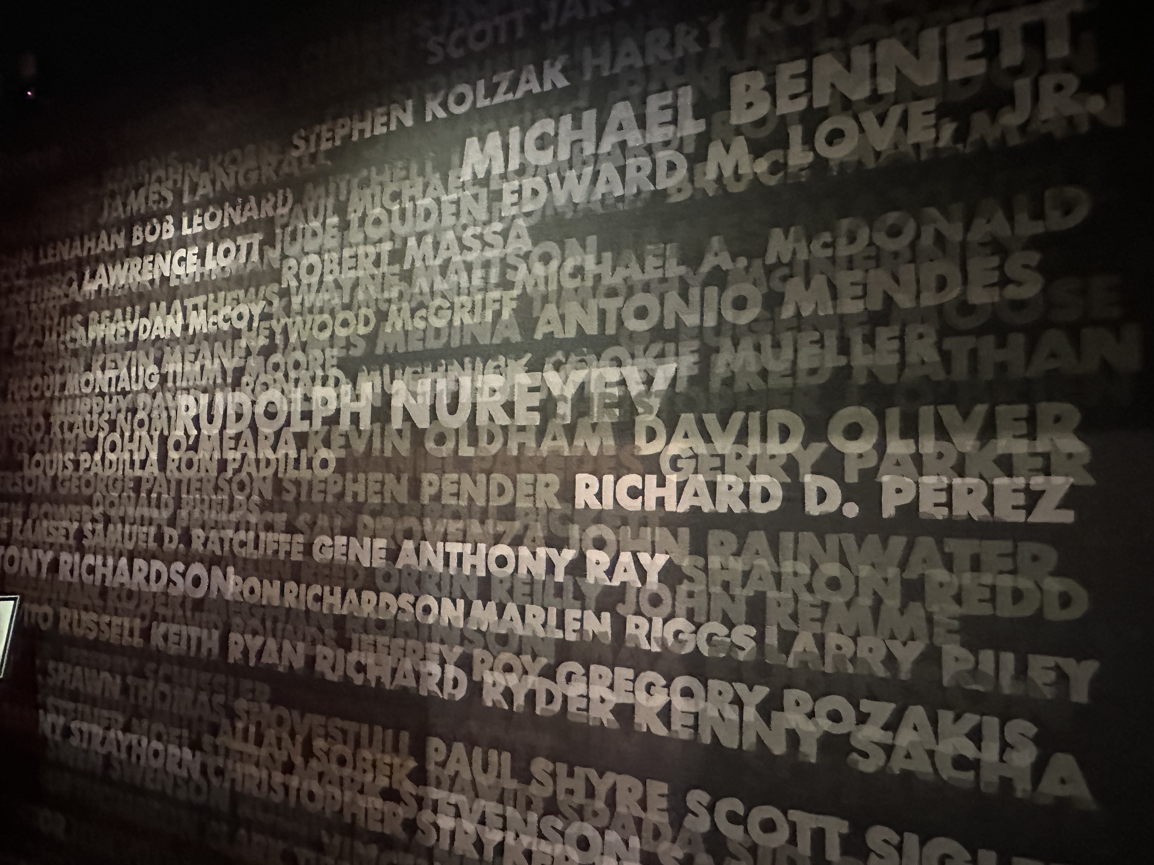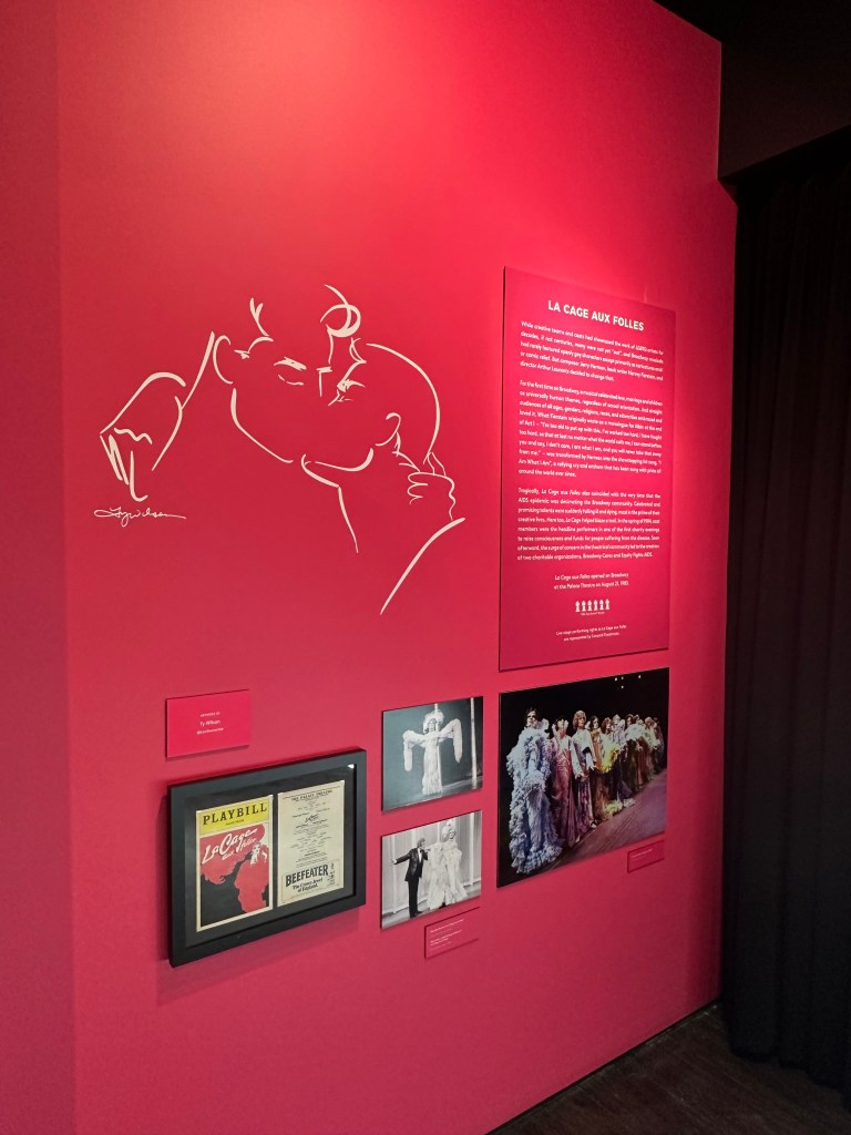 The next room underlines the impact of the AIDS crisis on the Broadway community, and the creation of Broadway Cares/Equity Fights AIDS. Red ribbons cascade down next to a two walls filled with names of those who died of AIDS in the creative community.