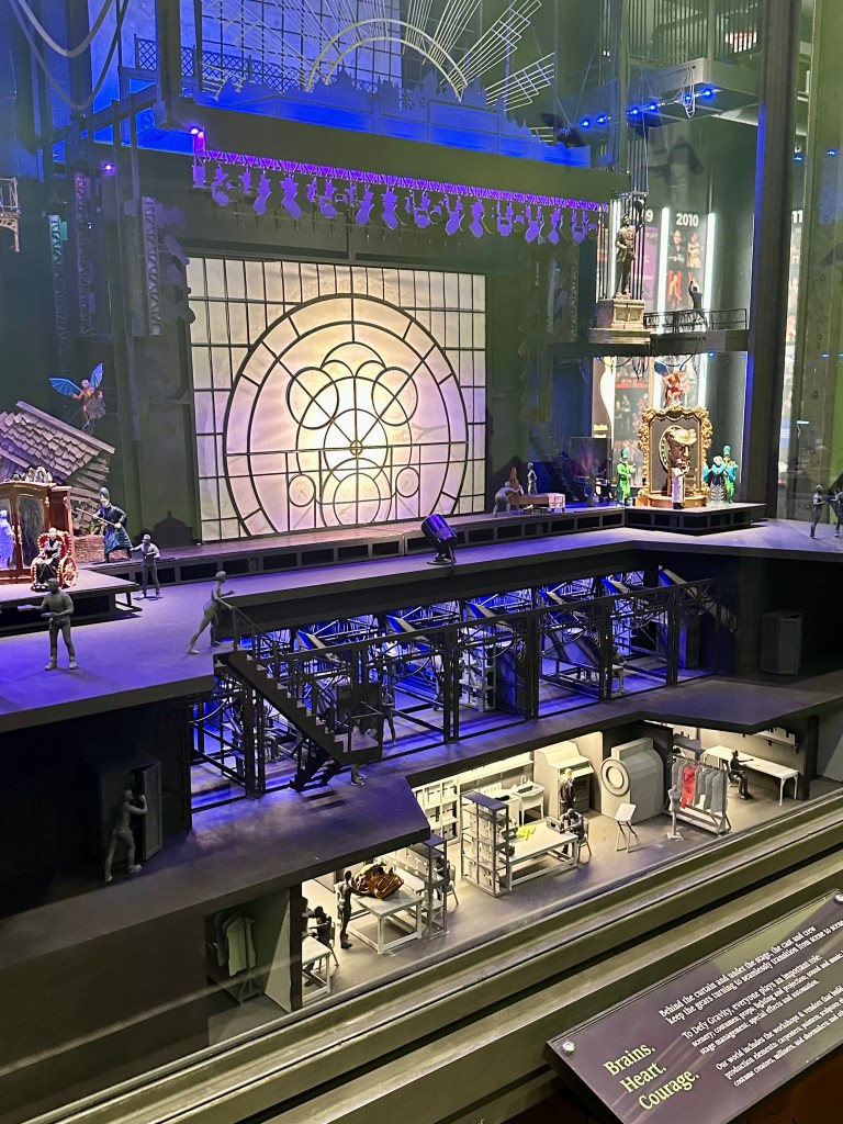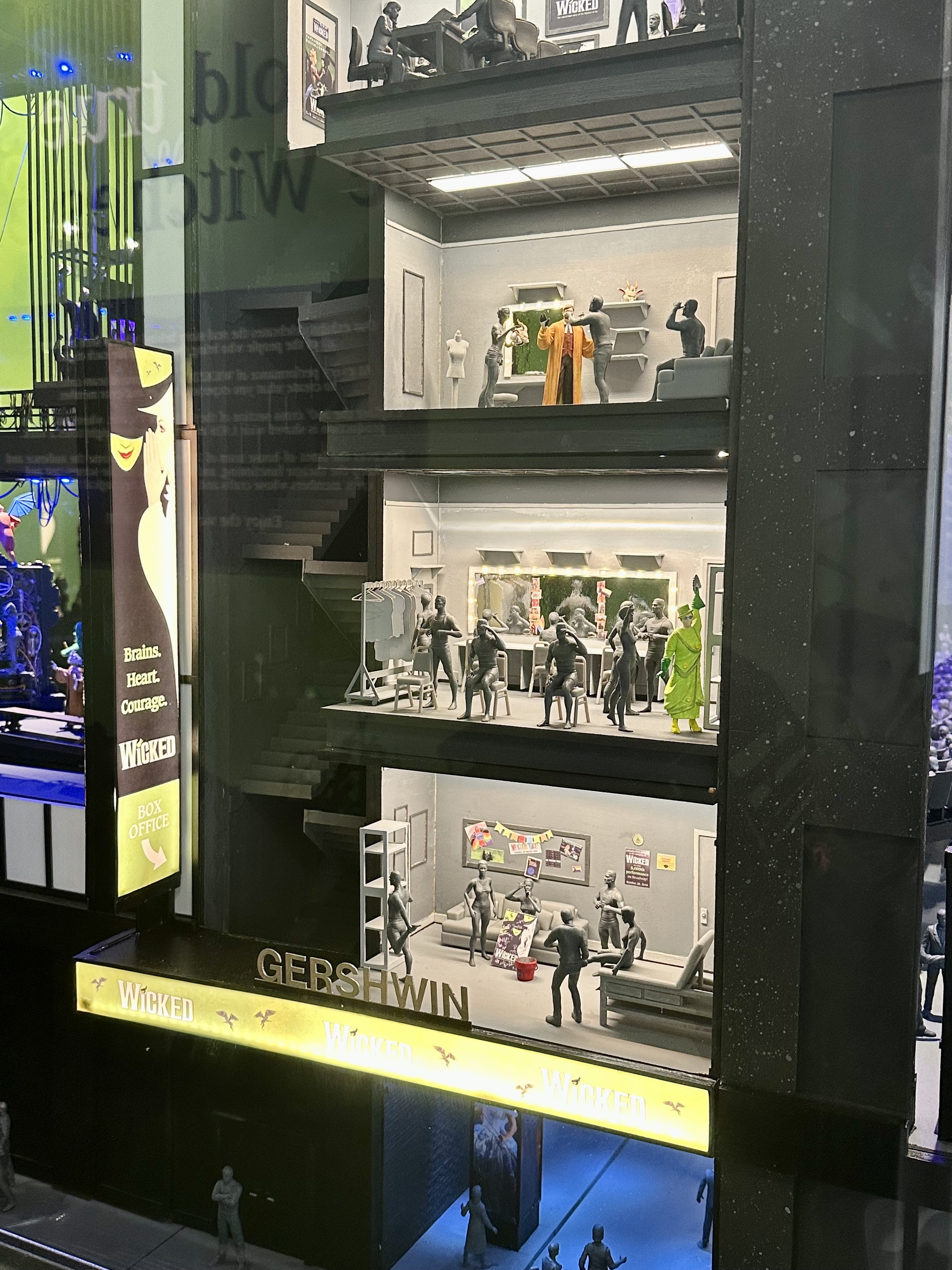 I loved the 360-degree set showing Wicked inside the Gershwin Theatre. You can see the public areas but also the backstage areas for warm ups and dressing rooms, and the backstage machinery that makes the set pieces move.