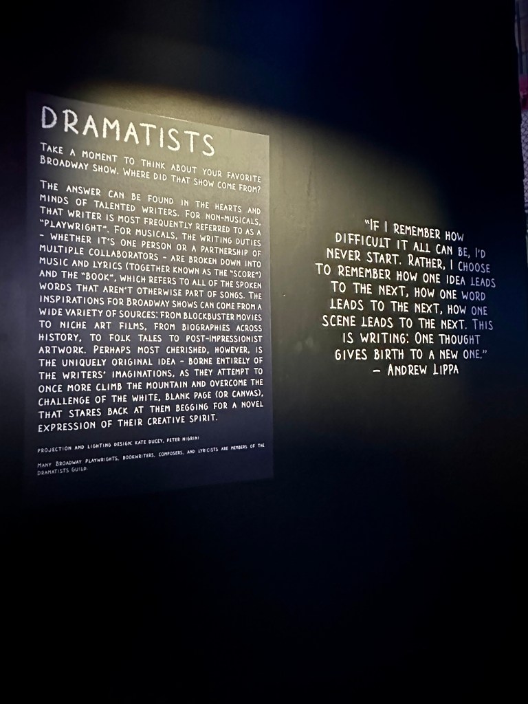 Leaving Broadway through the years, you enter a very informative session about the creation of a Broadway show, from initial playwriting, to production and design, casting, out-of-town tryouts, and arrival on Broadway. There are many video interviews with creatives explaining how stage managers/stagehands/makeup artists, etc., work.