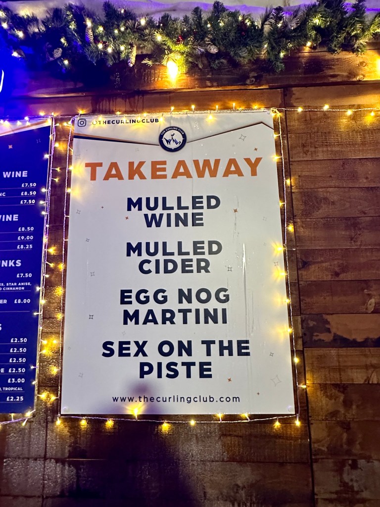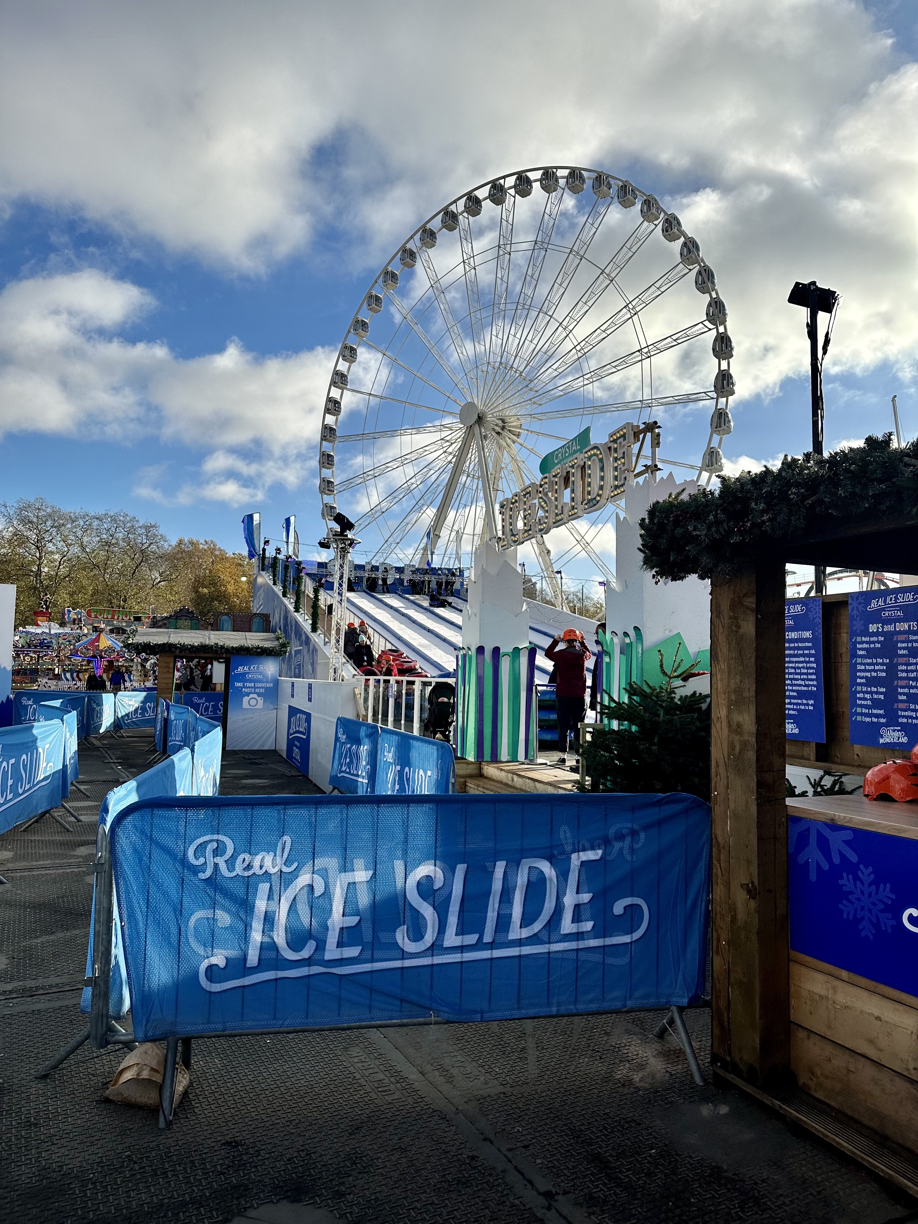In Hyde Park, they had set up a Winter Wonderland, with food, drink, and carnival rides. I discovered that a “helter skelter” is a traditional British ride where you sit on a mat and go down a curvy slide. There was a real ice slide that I went down – twice – on an inflatable tube, a haunted house, a fun house, and the opportunity to try “tornado chips” (a potato sliced in a spiral, skewered, fried, and dusted with garlic salt – absolutely delish).