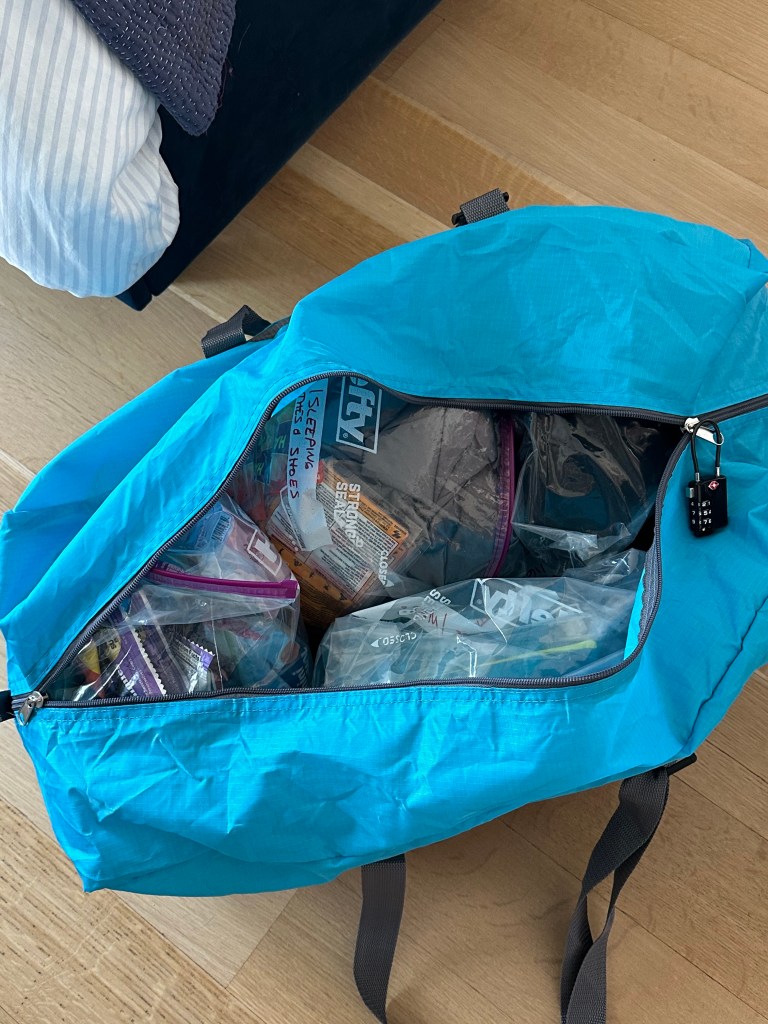 At Kilimanjaro, you start out in the rainforest (at least on the Lemosho route) and end up in the Arctic zone. Temperatures at the summit range between 20 and -20 degrees Fahrenheit (-7 to -29 degrees Celsius), and the wind can vary as well, influencing the perceived temperature. Because of this range of conditions, it is challenging to pack clothes and gear for this trek. There is also a weight limit to how much your porters are allowed to carry, dictated by KPAP. I won’t go into all the details about clothing and gear, as there are many sites (including Ultimate Kilimanjaro’s) to give you sample packing lists and even specific items that are recommended. The most important items are your hiking boots, which must be comfortable, supportive, and waterproof – and well broken-in. There are no huts to stay in on the Lemosho route, so I will be sleeping in a tent. No electricity, although I will take battery packs to keep my few electronic items charged. No running water, no showers. Below is what my duffle for the mountain looks like, with things organized in waterproof bags.