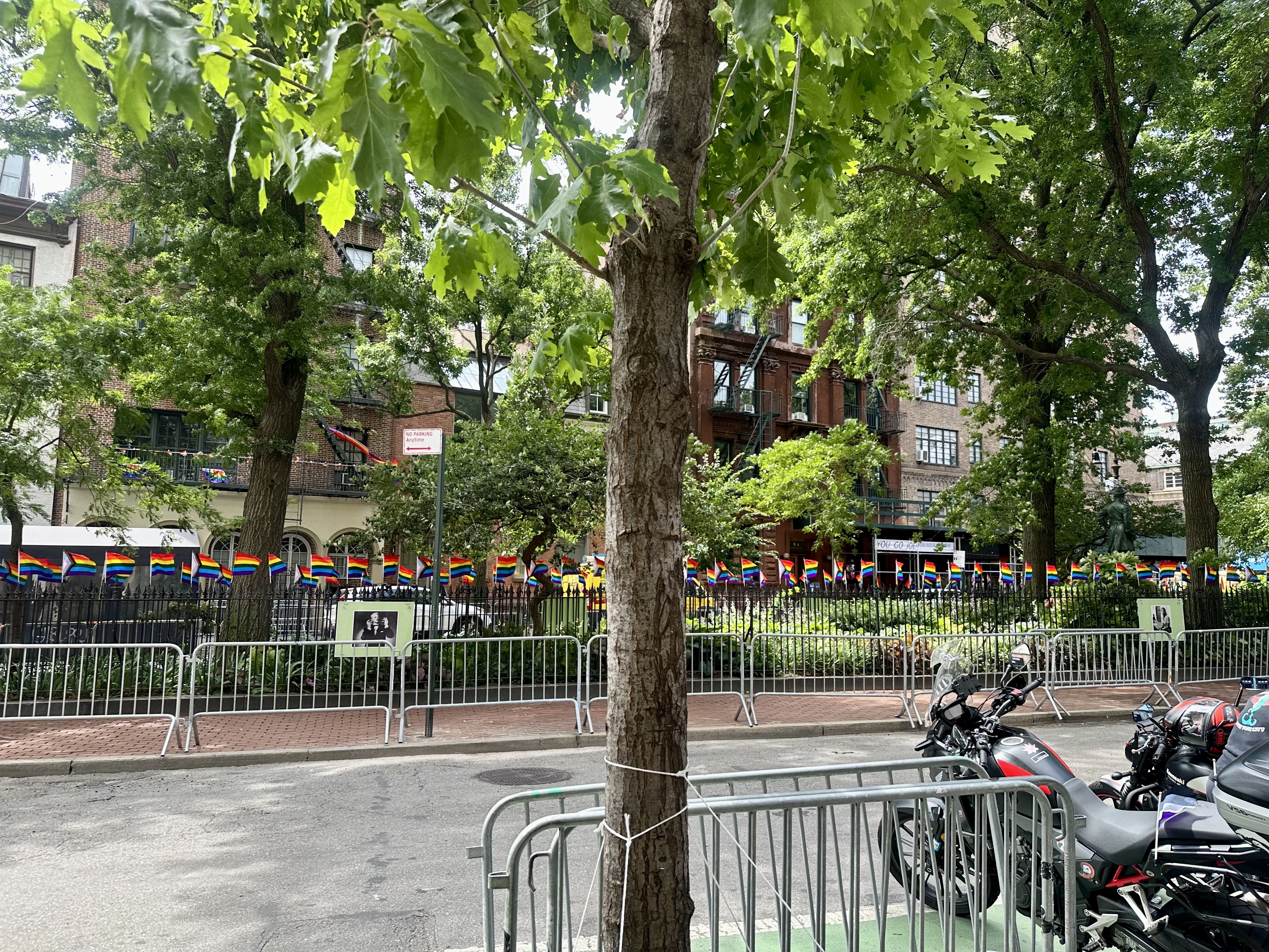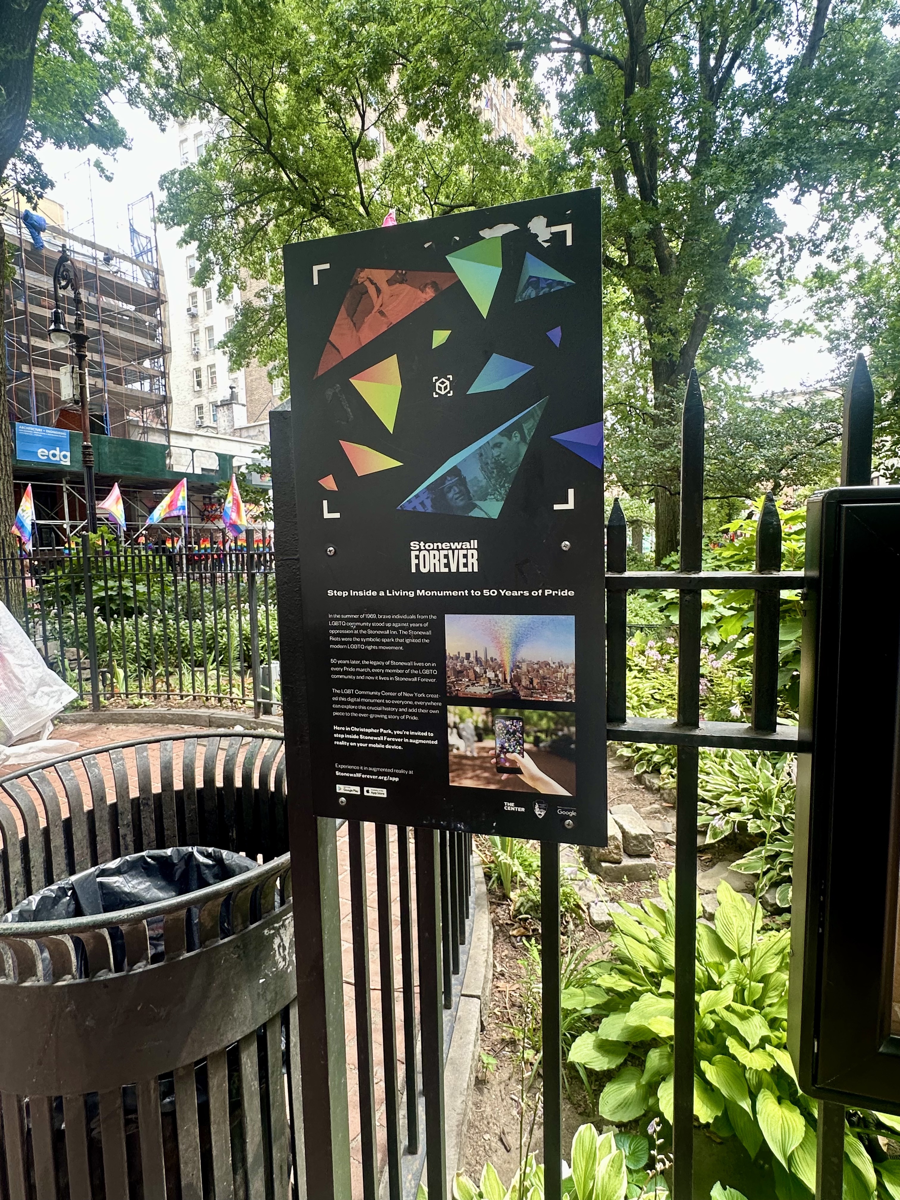 The park outside the Stonewall Inn has exhibits that are changed over time. Currently on display is “Stonewall Forever: A Living Monument to 50 Years of Pride.”