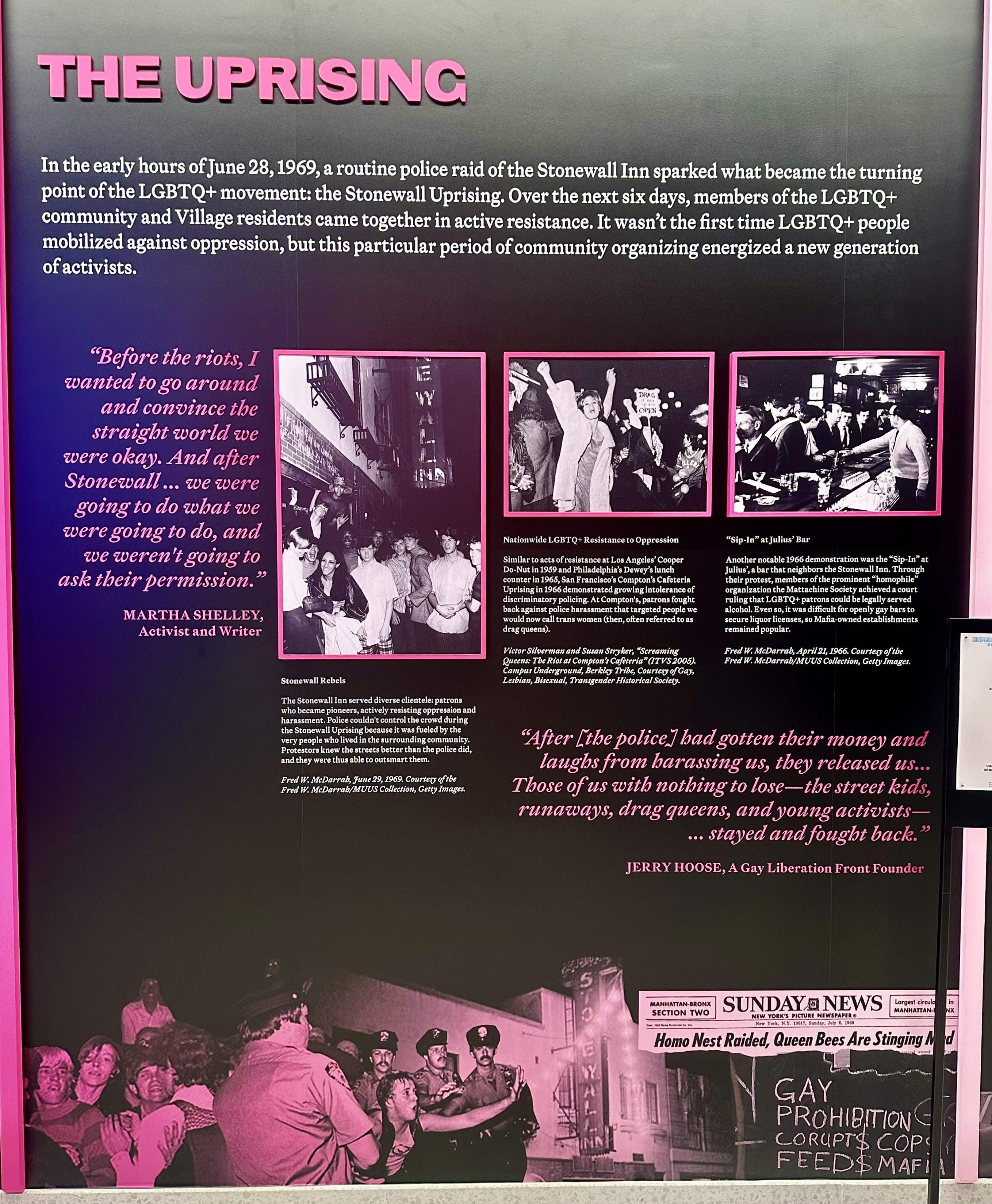 A reviewer for the NY Times criticized the newly opened Stonewall National Monument Visitor Center for delivering an overly optimistic view of how LGBTQIA+ rights have progressed since the uprising at Stonewall Inn in 1969. I get that, and this center does not pack the emotional depth of a visit to the National Memorial for Peace and Justice in Montgomery, Alabama – which I have also visited. Still, I personally found going to the Visitor Center to be a valuable experience, and one that I would recommend. While there is still significant work to be done to ensure equal opportunities for all, it is also important to remember the events in June 1969 which were the beginning of positive progress for LGBTQIA+ rights.