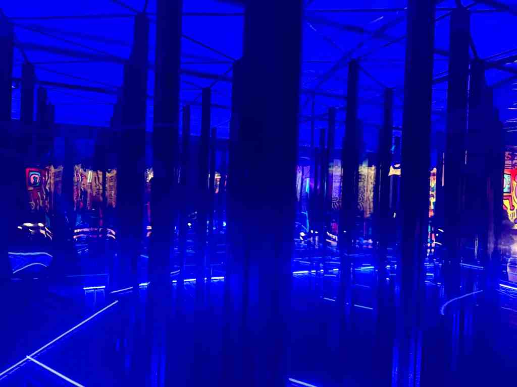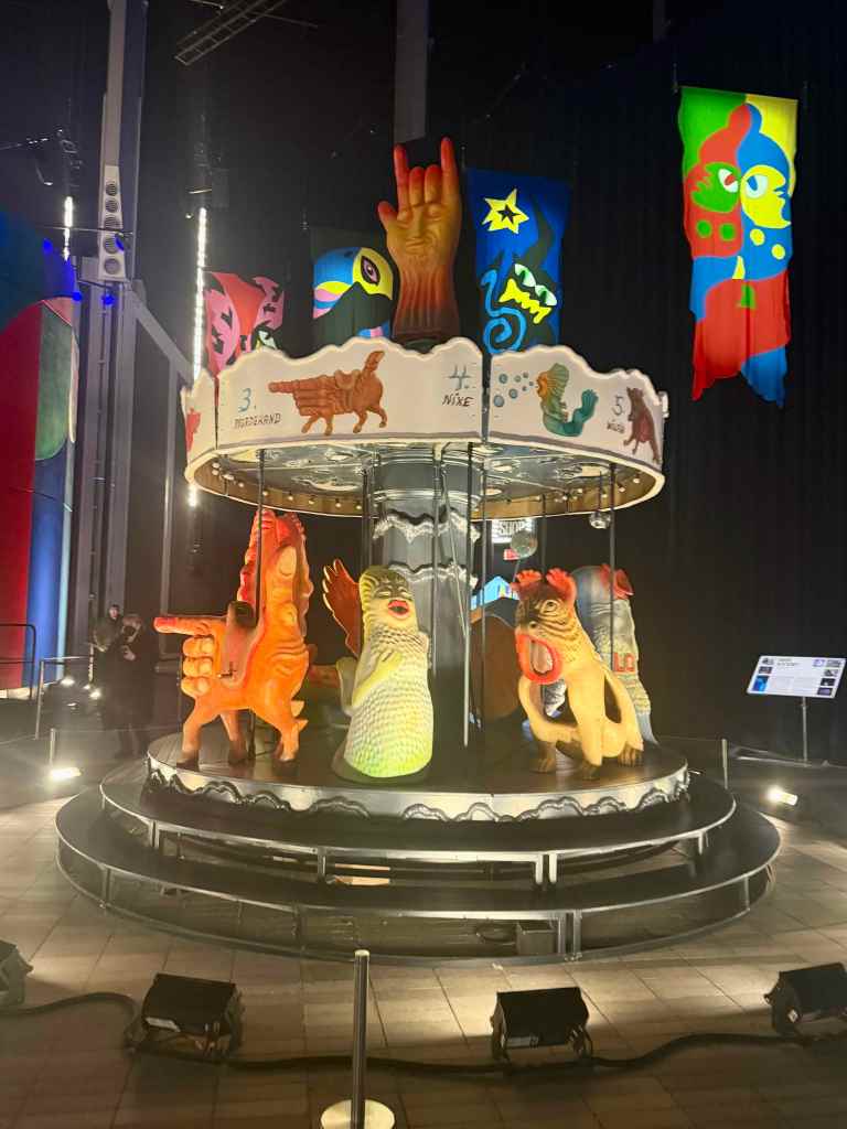 Going into a separate room from the one you first enter, you are immersed in music, lights, and several artworks that periodically turn on and move – a Sonia Delaunay-designed entrance gate, a huge Ferris Wheel by Jean-Michel Basquiat, a swing carousel by Kenny Scharf, and a small carousel by Arik Brauer. None of these can be ridden, but each has its own music and lighting when it activates.