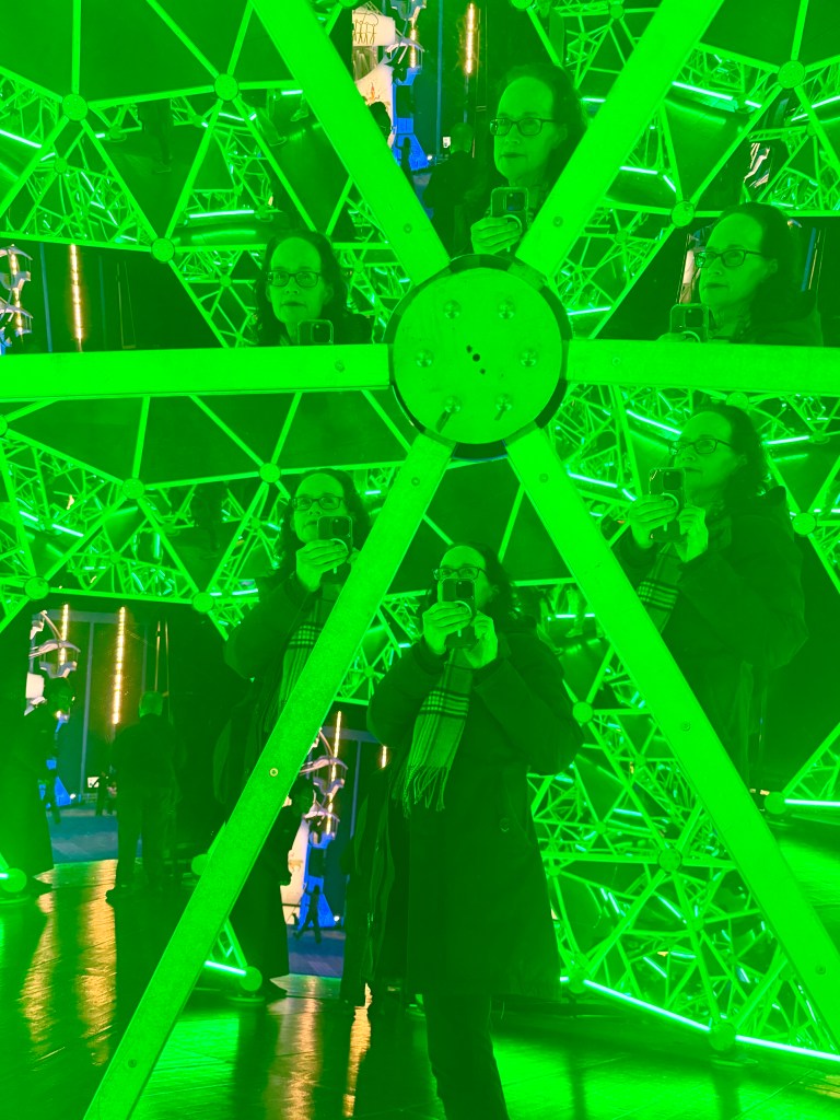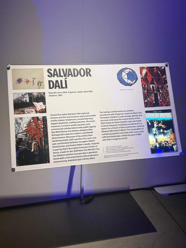 Salvadore Dali contributed a reflecting sphere, which you can enter after stepping on the sticky mat again. The lights and music change over time, and as you walk around all the mirrors reflect an endless array of reflections.