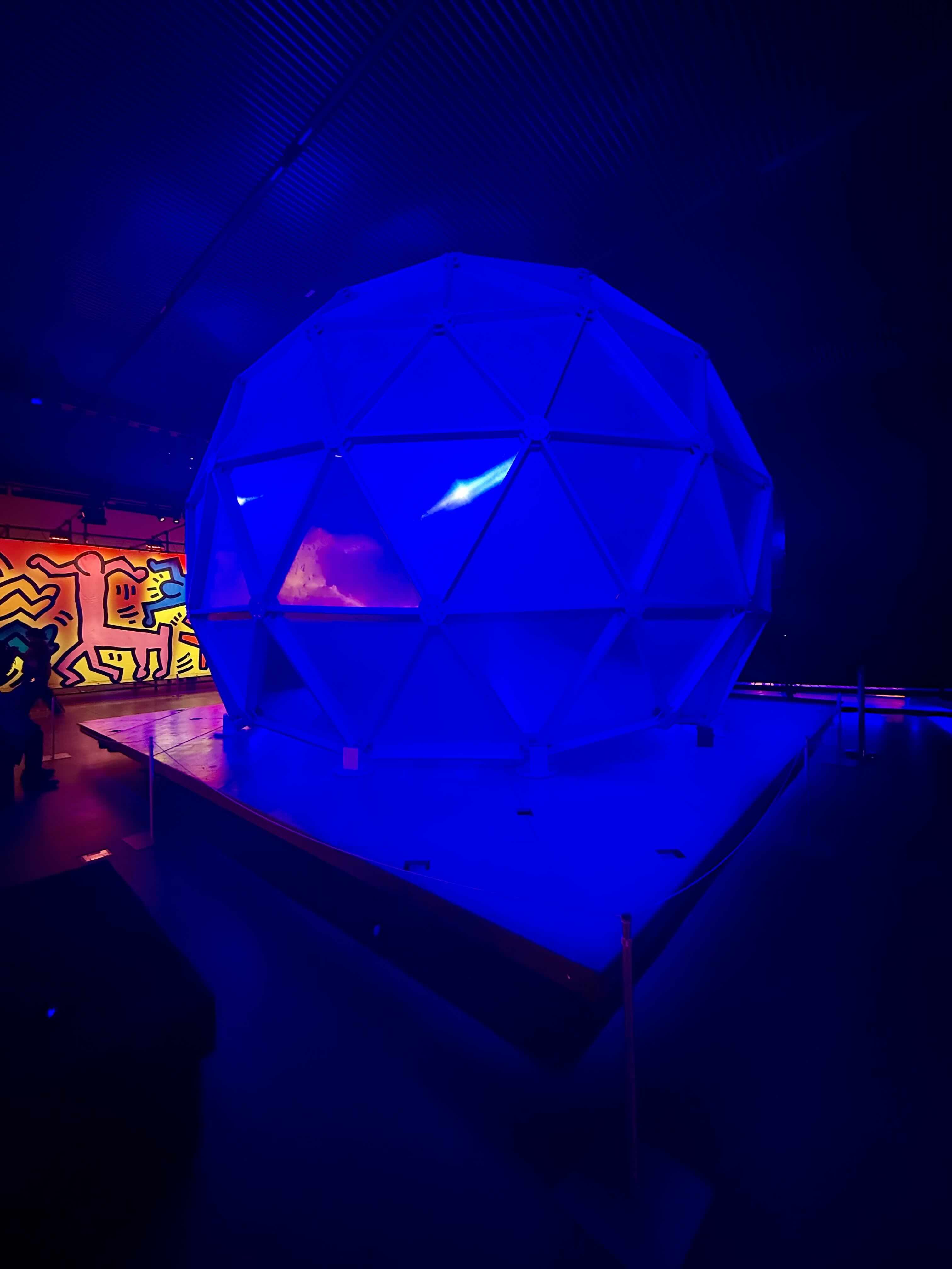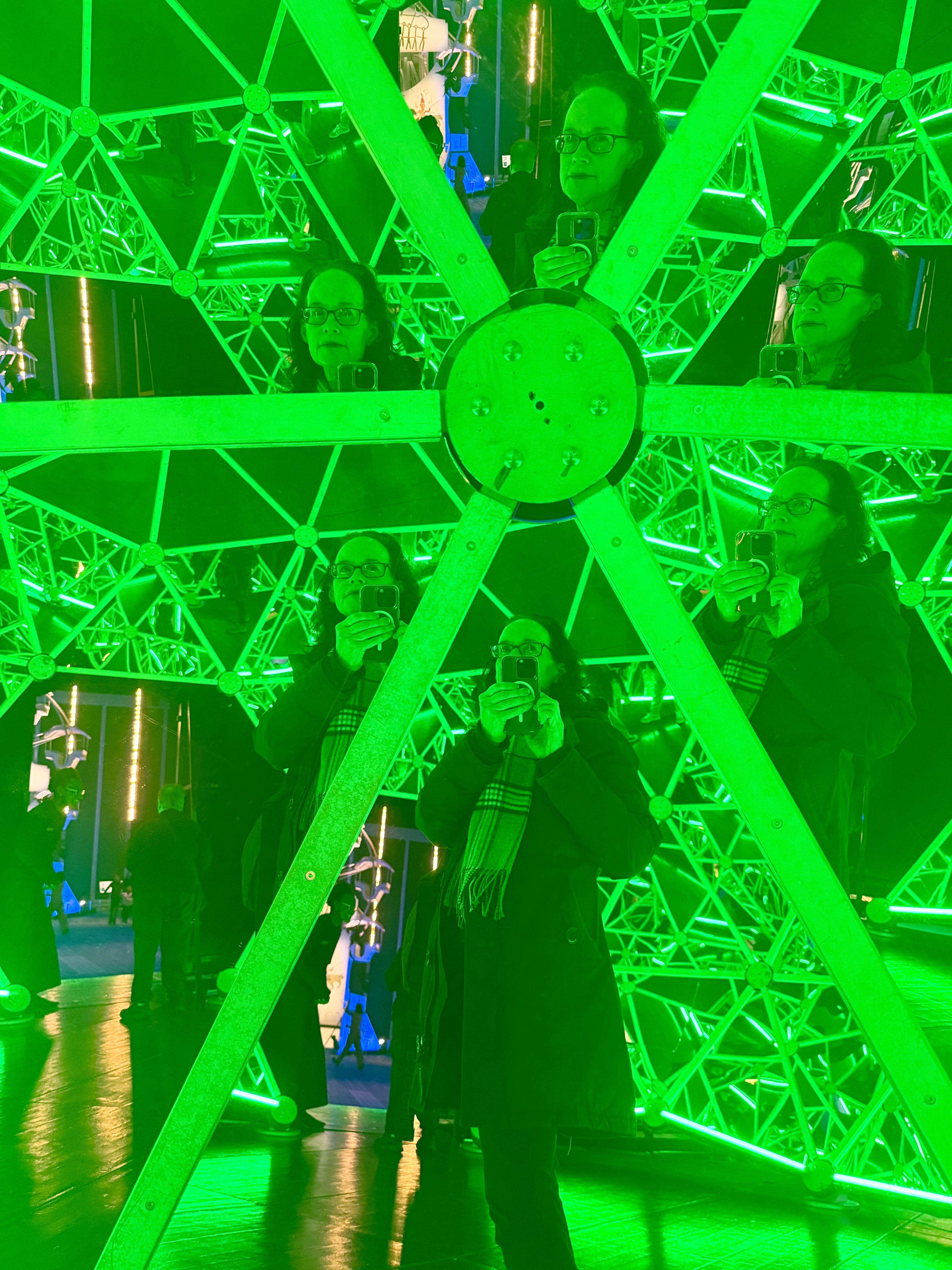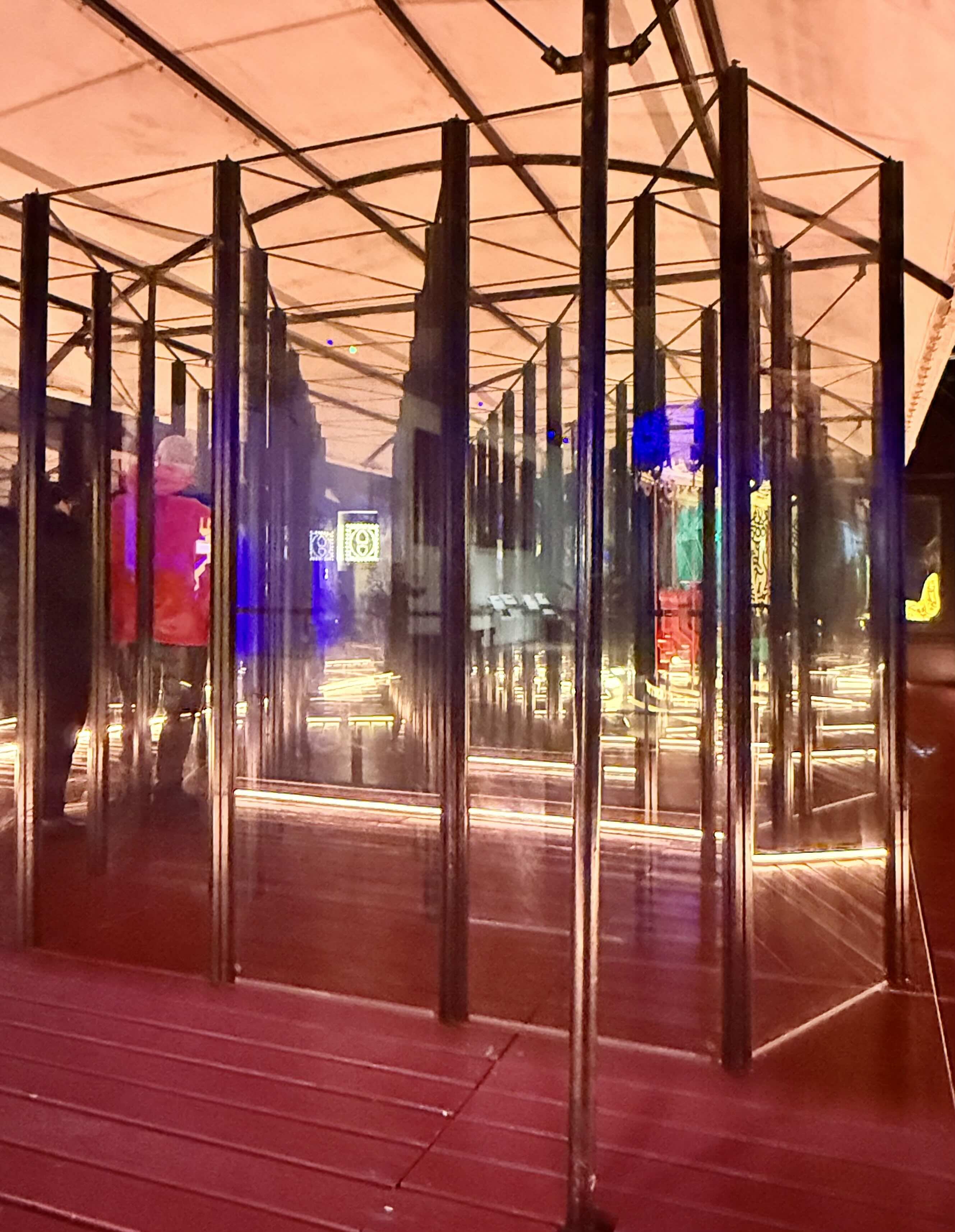 Salvadore Dali contributed a reflecting sphere, which you can enter after stepping on the sticky mat again. The lights and music change over time, and as you walk around all the mirrors reflect an endless array of reflections.