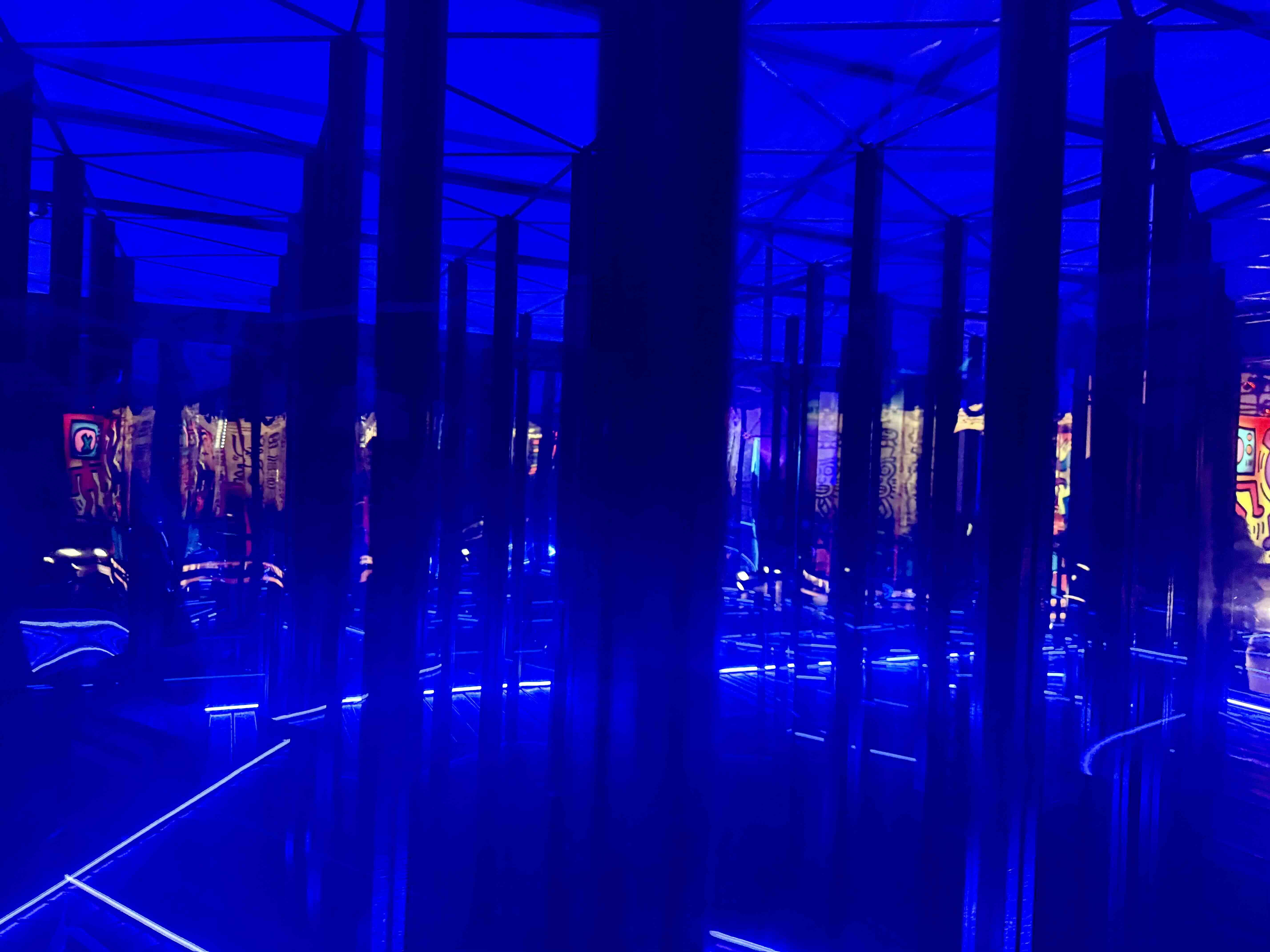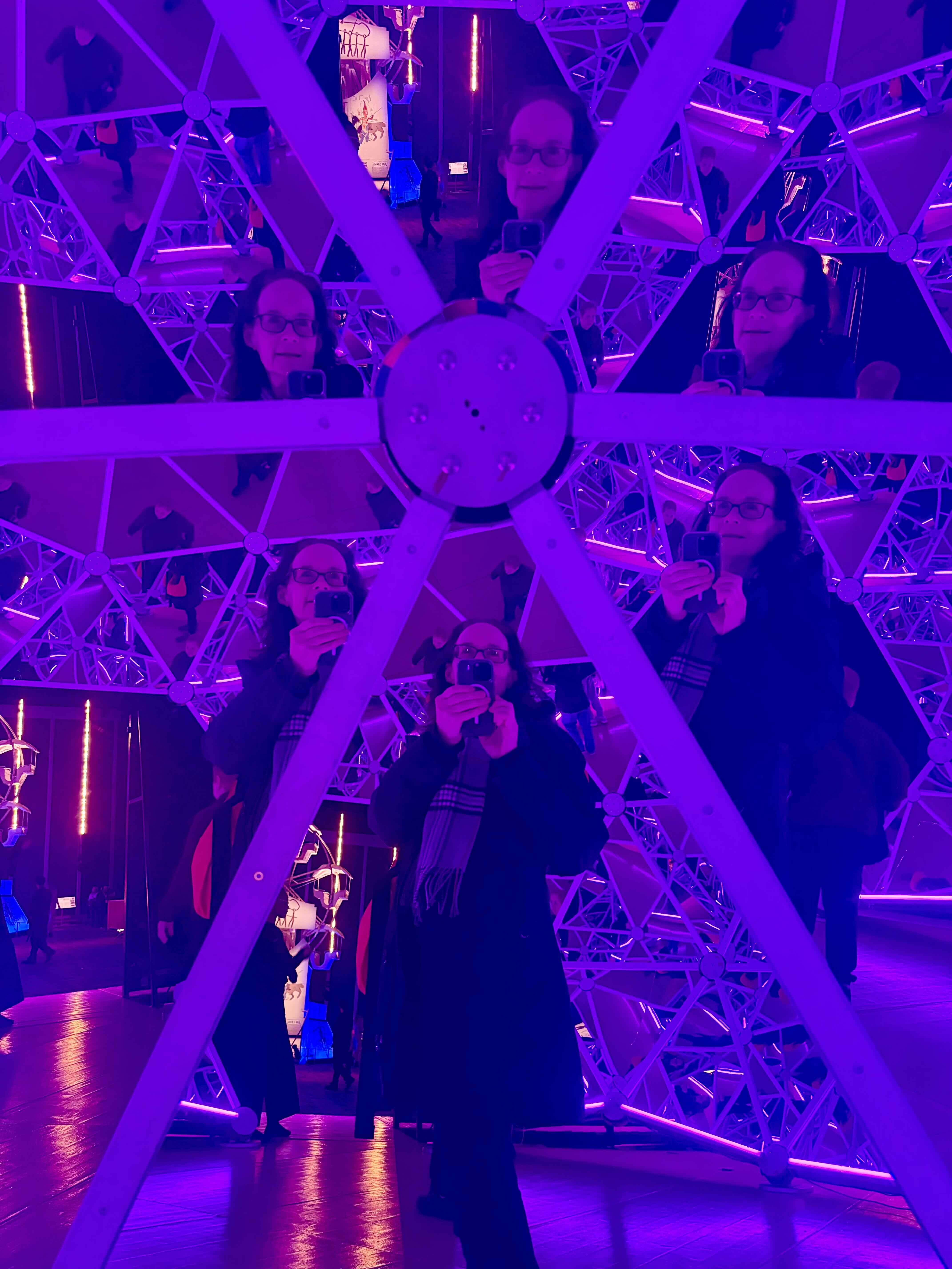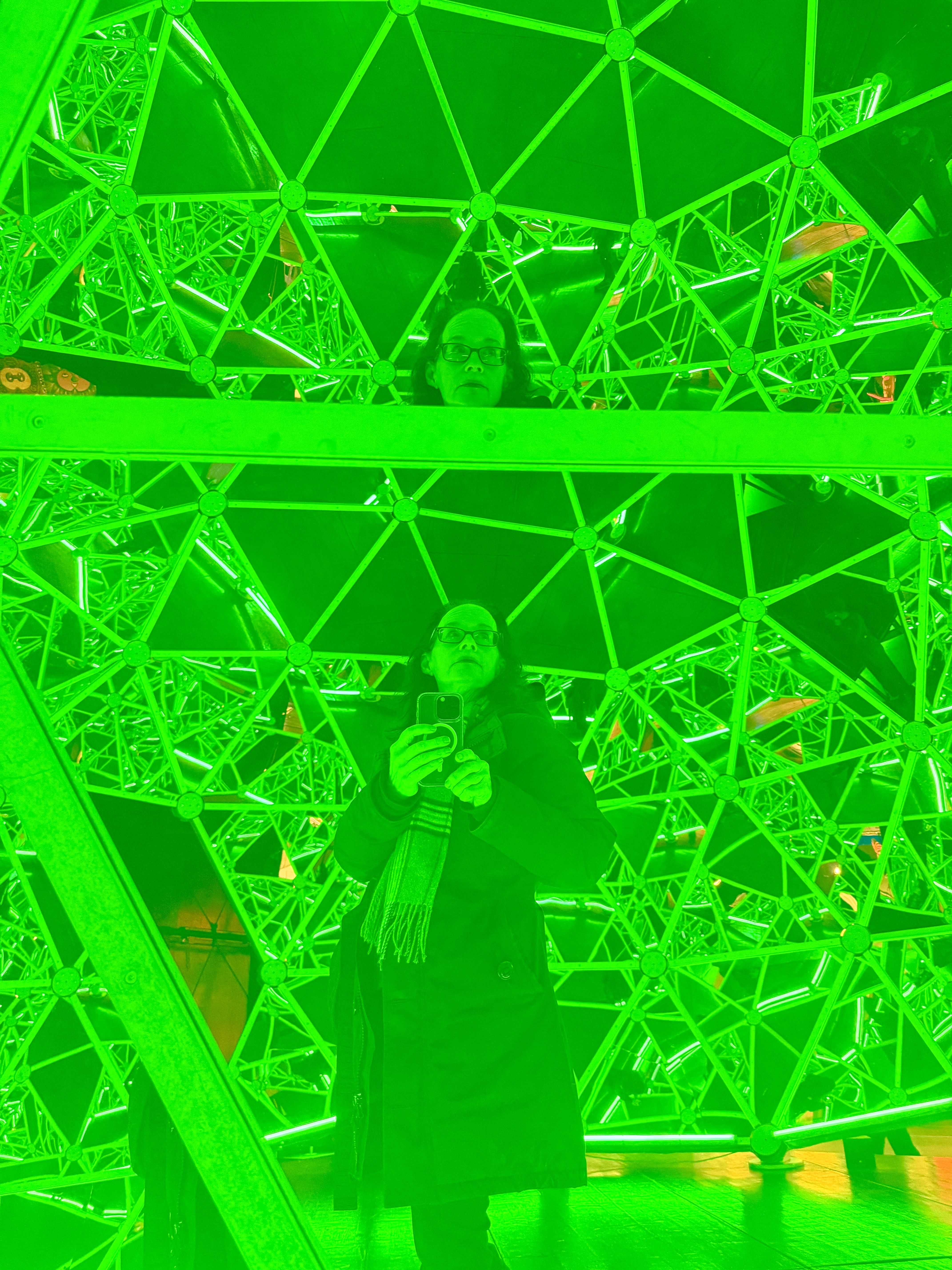 Salvadore Dali contributed a reflecting sphere, which you can enter after stepping on the sticky mat again. The lights and music change over time, and as you walk around all the mirrors reflect an endless array of reflections.