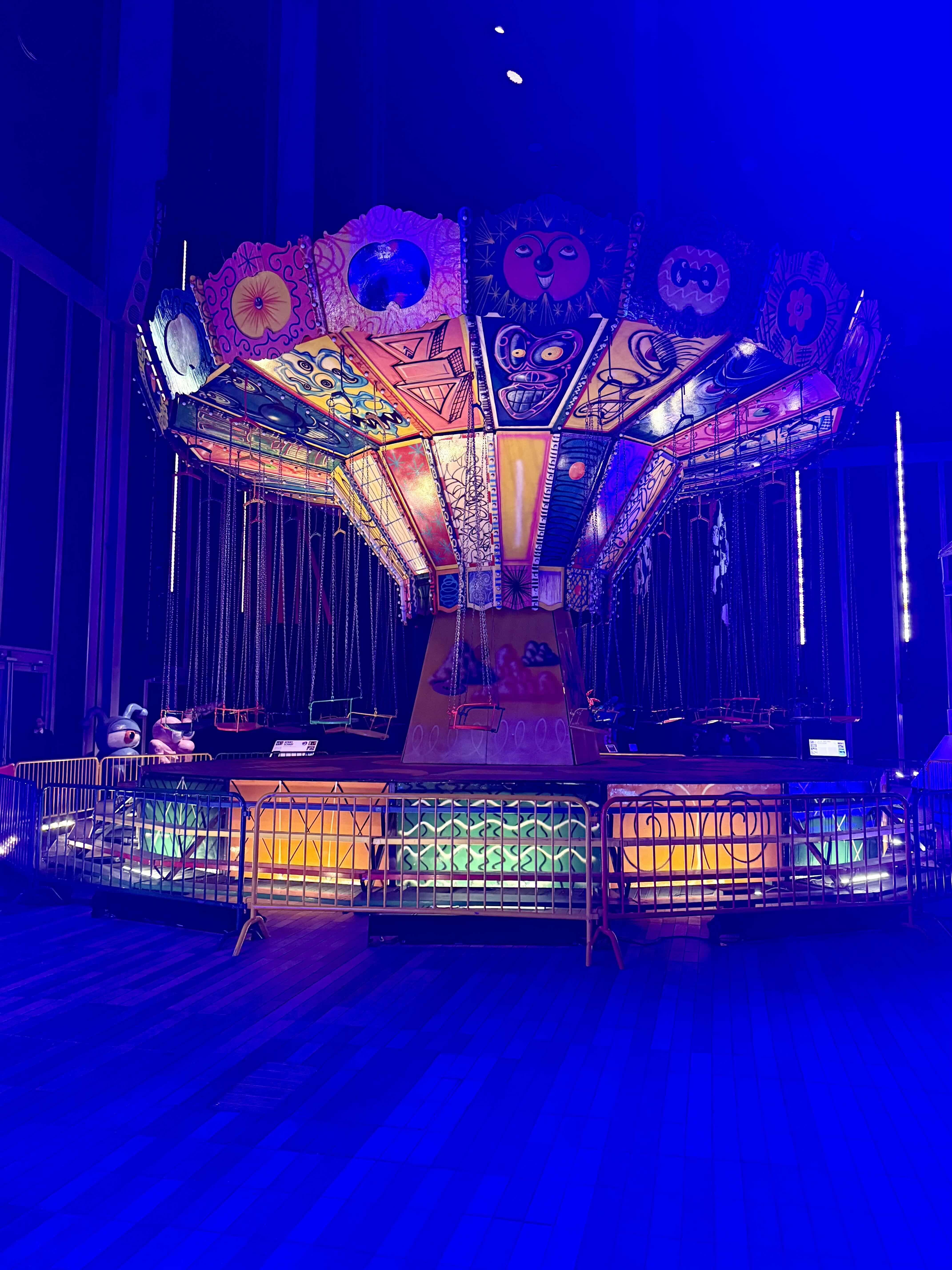 Going into a separate room from the one you first enter, you are immersed in music, lights, and several artworks that periodically turn on and move – a Sonia Delaunay-designed entrance gate, a huge Ferris Wheel by Jean-Michel Basquiat, a swing carousel by Kenny Scharf, and a small carousel by Arik Brauer. None of these can be ridden, but each has its own music and lighting when it activates.