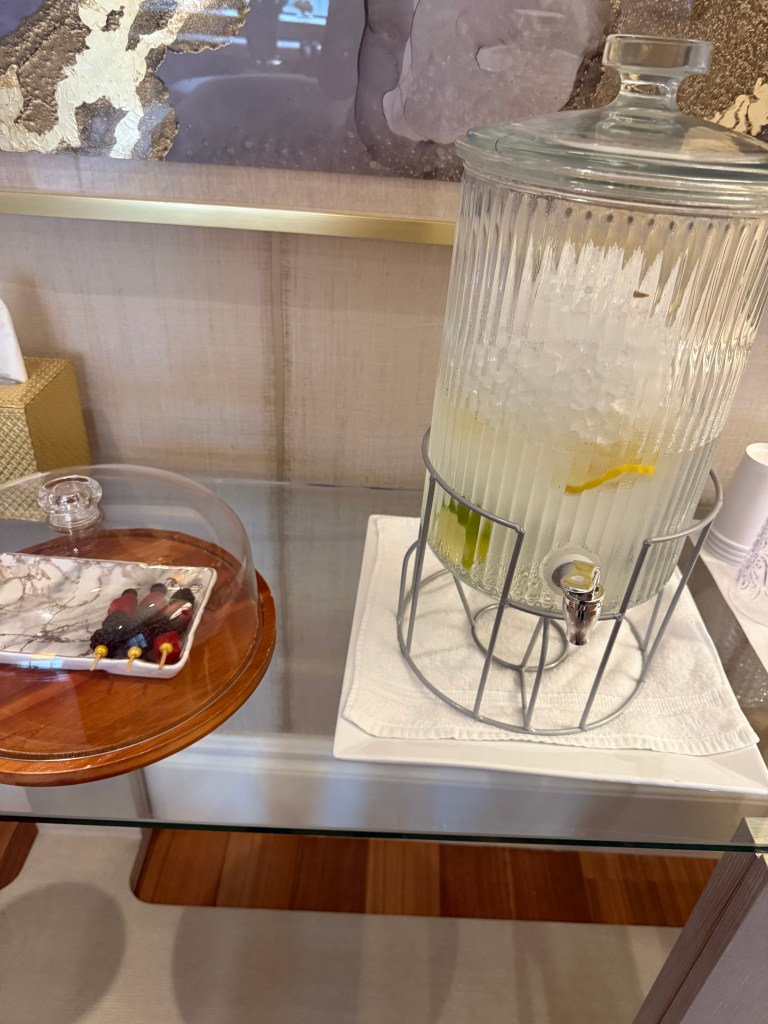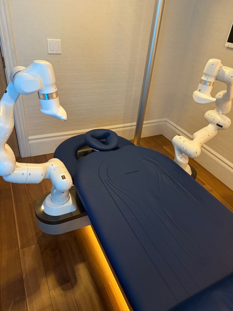 Now some details about the Upper East Side new location before concluding with some thoughts that apply to both locations. The new Aire is on E 61st Street, in a 120-year-old building that most recently was a storage facility for artwork MoMA did not have on display. This location is on multiple floors, while the Tribeca location is generally on one level (except for the massage area). It has the same pools, but things are laid out quite differently. The vigorous whirlpool was more enjoyable to me at this location because it has slots big enough for one person to rest in and almost recline, leading to why the attendant called this one a “aqua massage.” The tepid area doesn’t have the semi-private nooks to relax in, so I prefer the Tribeca one. The steam room and hot and cold plunge areas are relatively equivalent at the two locations. The biggest different is in the salt pool, which on the Upper East Side is a level up from most of the other pools and has a clear floor so that it appears to be suspended from the air. However, the pool is not as deep (perhaps the weight of the water was too much to suspend if it were deeper) which to me makes the floating a little more difficult. The Tribeca salt pool is probably 3 feet deep and I would guess the UES location is 12-18 inches deep at most. While this pool looks cooler, I prefer the Tribeca pool. Like Tribeca, they also have heated stone loungers and infused water/mint tea at the UES location near the pools.