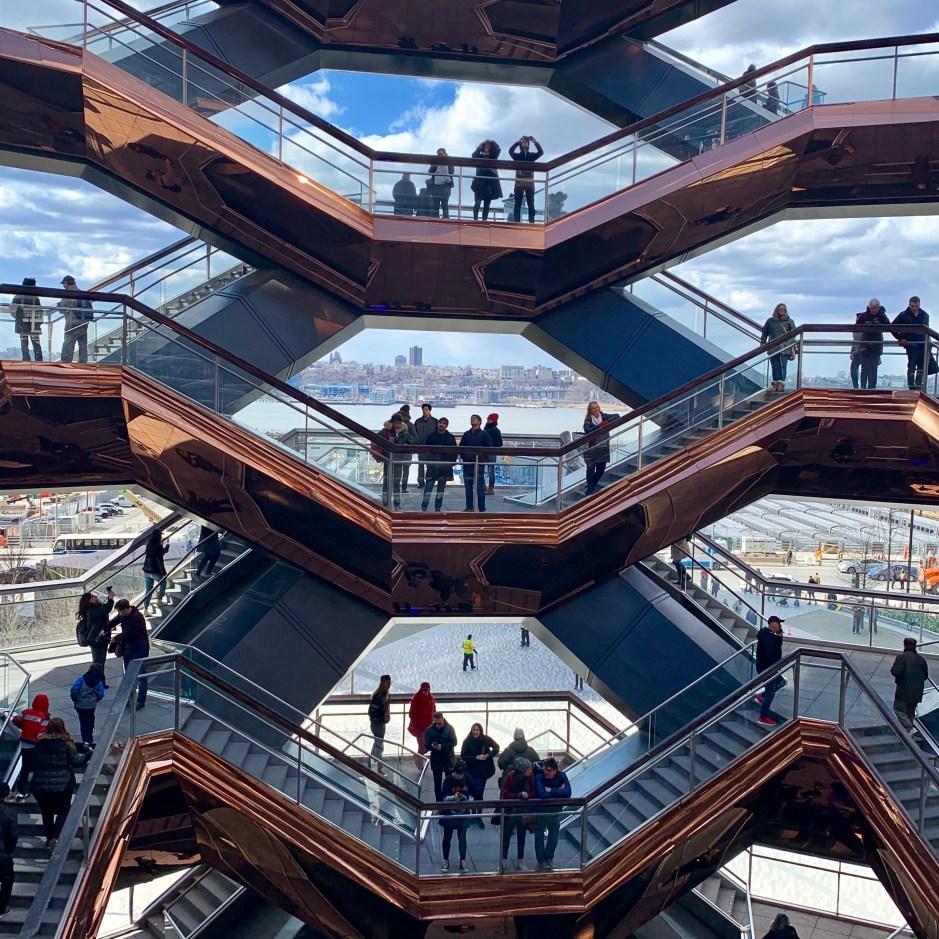 The Vessel is a concrete and copper outdoor sculpture with 2500 steps and 154 flights of stairs, eventually reaching a height of 16 stories. There is an elevator and ramps to make it accessible, but if you are able to explore it by foot, I recommend doing so. The stairs don’t seem too intense since they are short flights and you keep stopping to look at the views (however, you must wear comfortable shoes, and my calves were sore the next day despite not thinking it had been too bad while on the Vessel). It’s also not possible to do a direct trip, because the sections keep going up and down on each level. What I did was to go up (back and forth) on the Hudson River side to see those views, walk around the top to see all the views from there, and then walk back on the east side of the Vessel to see different views from that side.