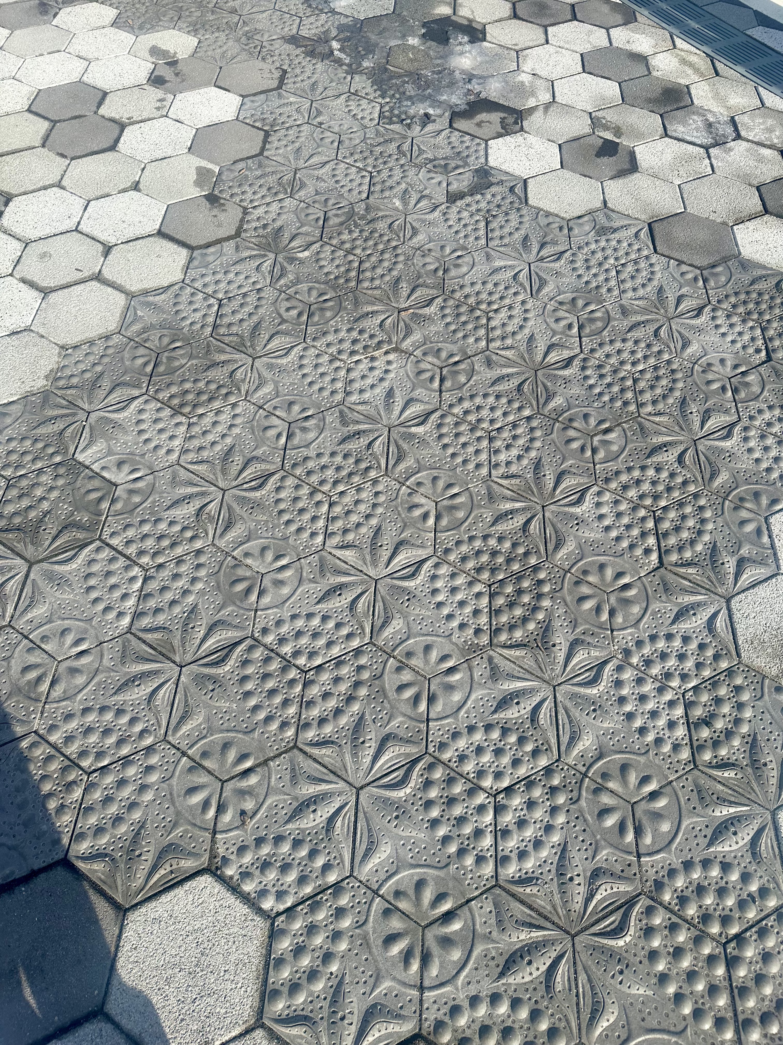 The tiling on the walkway is inspired by diatoms, single-celled microscopic algae. They are the base of the food chain in the river, and convert sunlight into energy. There can be hundreds or even thousands of diatoms in one spoonful of East River water. For more details about the use of these diatom-patterned pavers, check out the description from the artist who was involved, Stacy Levy.
