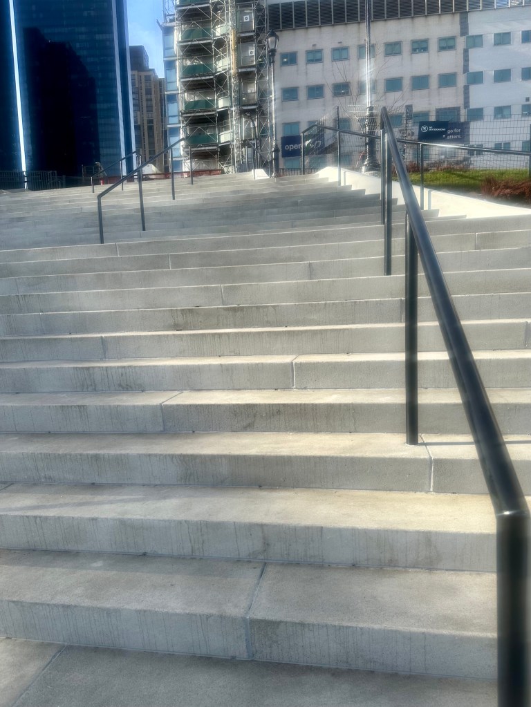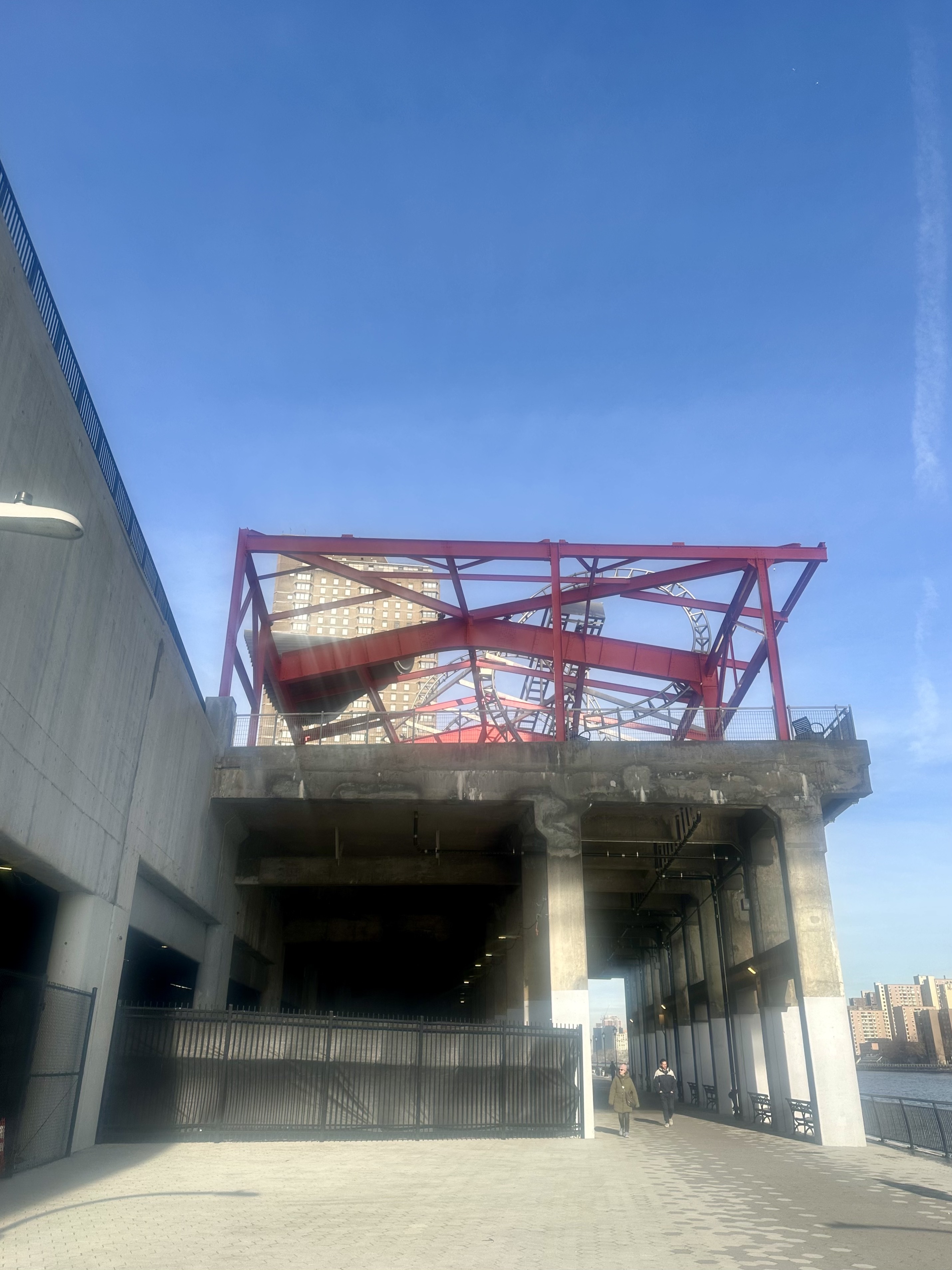 As you start to connect to Andrew Haswell Green Park at East 61st, you can’t help but notice the thing that looks like an abandoned steel roller coaster track. In fact, it is an artwork by artist Alice Aycock, called The Roundabout. A little more about that as we exit the new walkway next to it!