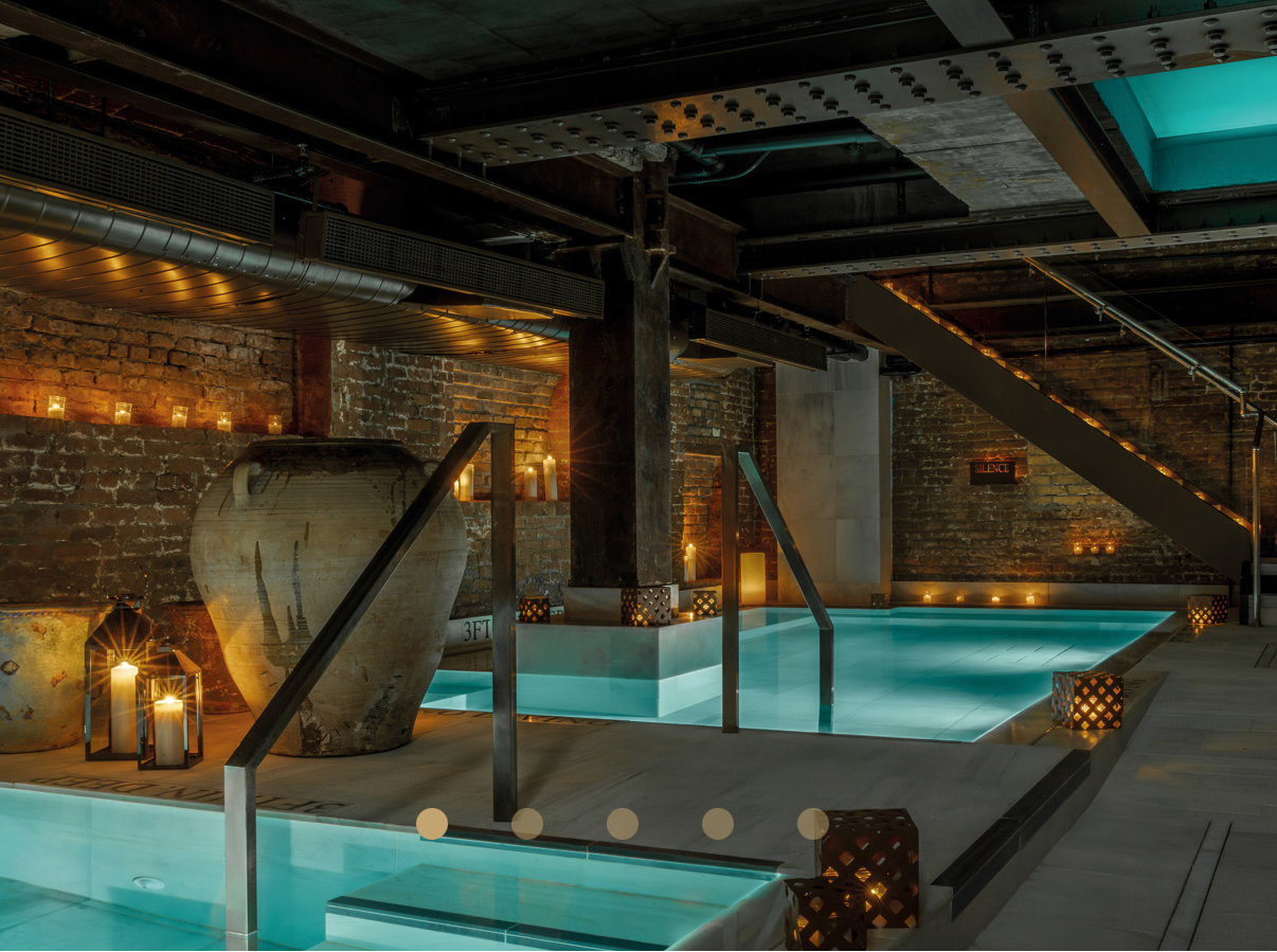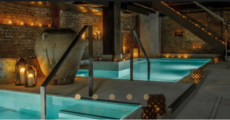 The ambiance inside is magical. It is lit with thousands of flickering votive candles (more, I think, at Tribeca than at Upper East Side), and there are multiple pools to experience. If you have not been before, an attendant will show you around the different options. There is a steam room, a vigorous whirlpool, a very hot pool, a cold plunge pool, a “tepid” pool which is roughly body temperature, and (my favorite) a floating salt pool. Before you get into the salt pool, there is a shower and you can scrub with a gigantic pile of salt for exfoliation. Then in the “floatarium” you can literally float, weightless. I find it possible to anchor my head along the rails at water level and just float. With your eyes closed, it approximates a sensory deprivation experience. I generally start out in the steam room, go to the whirlpool, alternate hot and cold pools, then relax in the tepid area (there are multiple semi-private nooks to relax in), but spend most of my time in the salt pool. There are also heated stone loungers where you can enjoy infused water or mint tea.
