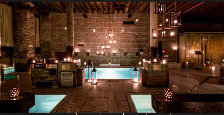 The Tribeca location is the OG, and obviously the one I have been to the most. I see that the Tribeca location is closed temporarily for renovations, but should reopen in May. It’s located on Franklin Street, in a restored 1883 building that was once a textile factory. As with all Aire locations, it is inspired by baths of the ancient Roman, Greek and Ottoman traditions. When you enter, you immediately note the luxe and relaxing vibe – dimmed lights, nice scents, big sofas with comfy throw pillows, infused water and warm mint tea to sip. They always send an email to check in the day before, and if you have done that, you will just need to show an ID and take a rubber bracelet or bracelets to wear (these let the staff know how long you will stay in the baths and if you are having additional treatments like a massage). Shortly you go back to the changing room (separate for men and women), where you are given a locker (you lock and unlock with a code you set), robe, little black neoprene booties to wear to prevent slipping, and a towel for afterwards. You wear your own swimsuit, and put the robe over it. You are required to leave everything behind in the locker – especially your phone.