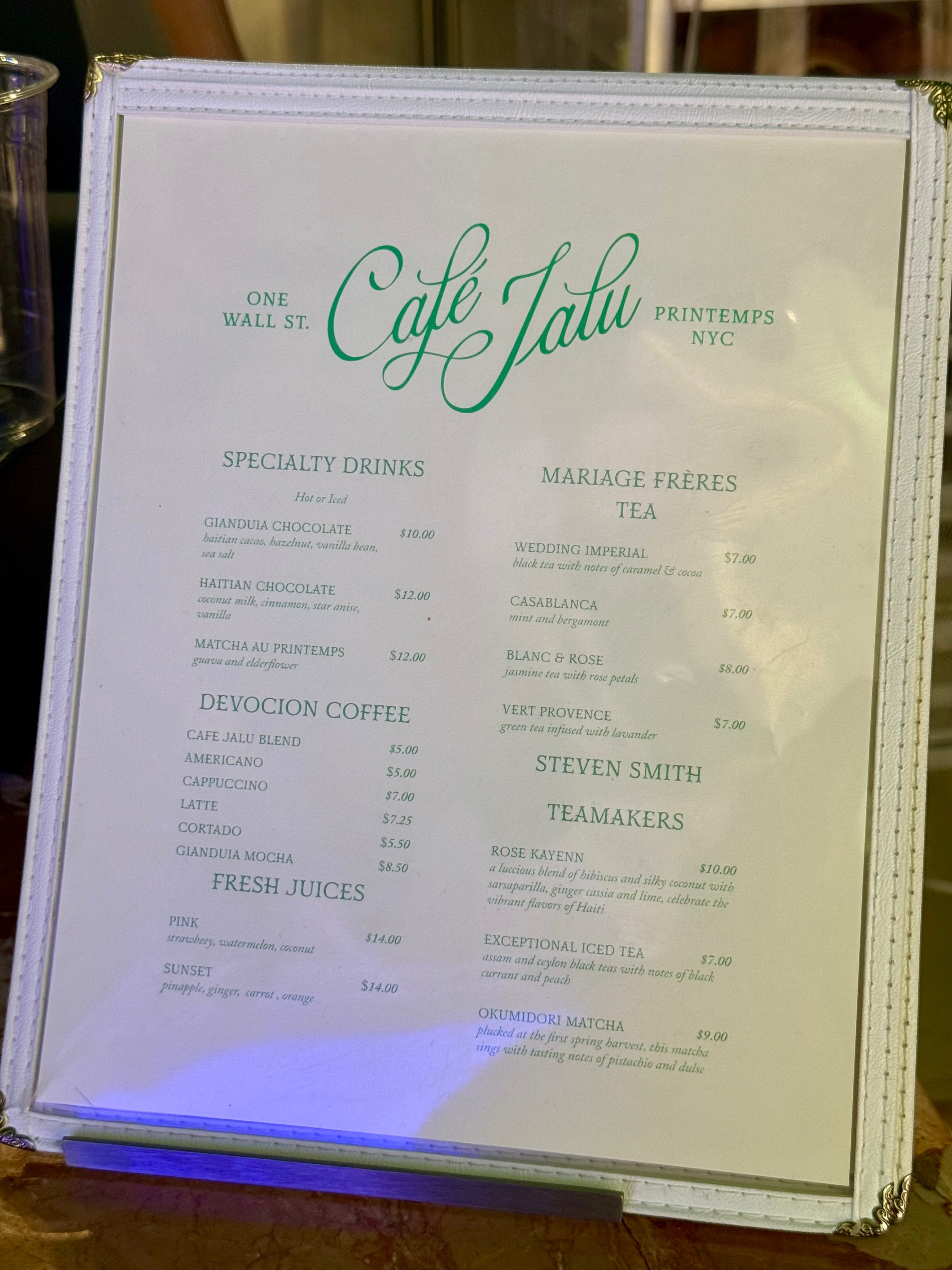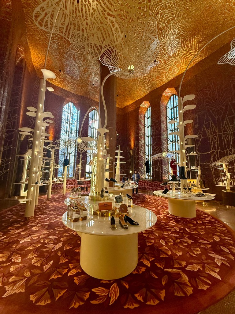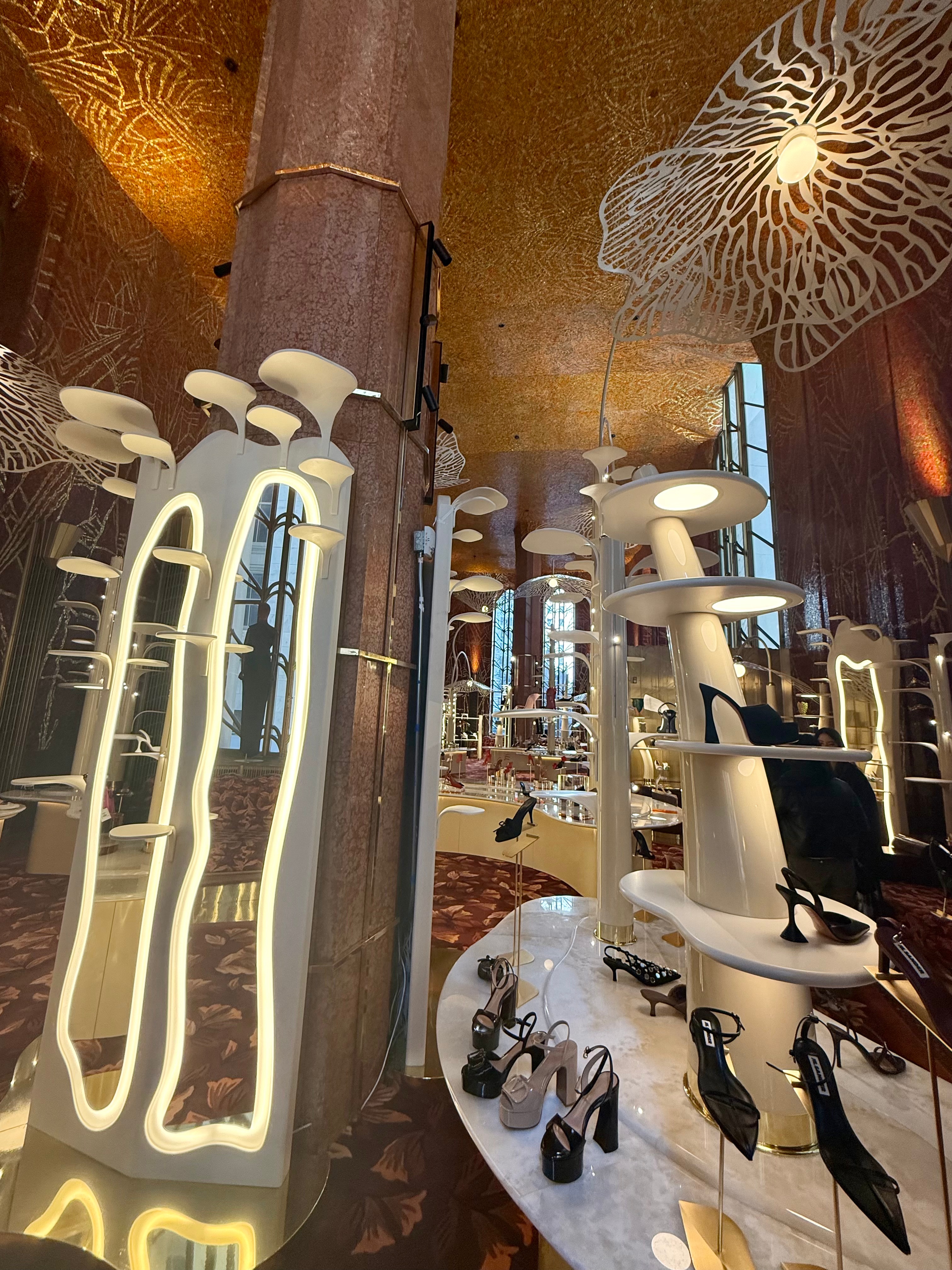 The Red Room at Printemps is a functioning shoe store, and I dare you to find a more extraordinary one. Photographs truly don’t do it justice. If you entered Printemps NYC from Wall Street and experienced the Red Room first, the rest of the store – while gorgeous – would be anticlimactic after such opulence. If you visit on a weekend or later in the day, you might actually have to wait on a line to get in and you will see plenty of people taking photos and posing in the entire store, but particularly in the Red Room. My recommendation, if you possibly can, is to get there very soon after opening (hours are 10am-7pm daily) on a week day to avoid crowds. If you go early, it will be easier to enjoy the cafe as well (the cafe opens earlier most days, at 8am). Going later in the day would be an alternate plan, and enjoy a drink at one of the bars for the most elegant happy hour. The Red Room bar is open later, until 11:00pm, and the restaurant Maison Passerelle is open 5pm-10:30pm.