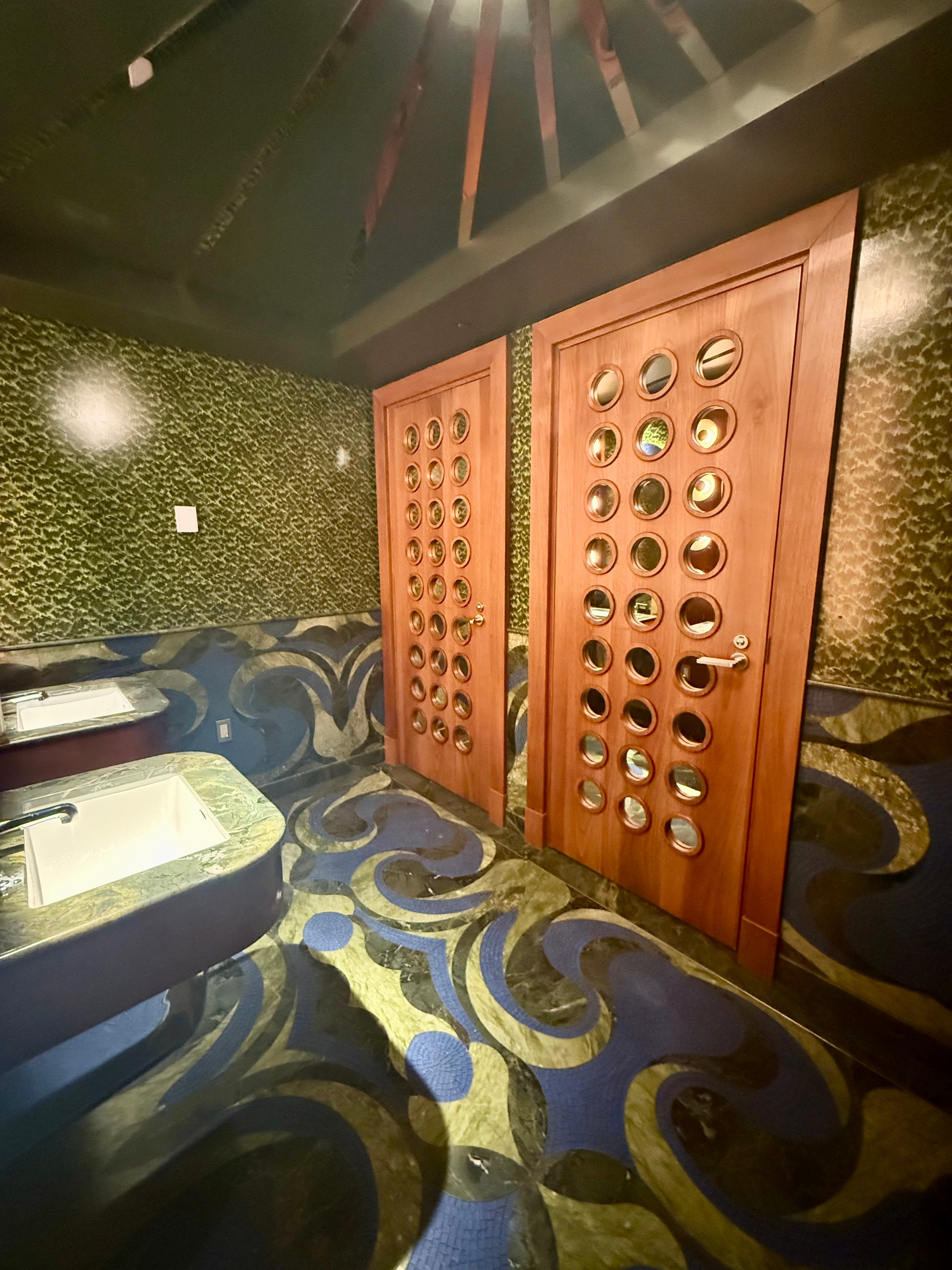 The outside of the building has the windows covered in newspaper, and if you look closer you will see some articles about the original Broadway production of Phantom, and others reporting on the fictionalized goings on at the Opera Populaire that occur during the musical. You line up outside, and if you don’t already have a mask, you can be given one. I quite liked the provided one, it was comfortable, even under glasses, and has a little Phantom mask motif. At least for now, you are asked to dress up and wear black, white, or silver, and you will likely see some people extremely dressed up and wearing their own masks. It does make the entire experience a little more like an “event” to have most people dressed in cocktail (or even ballroom) attire, with the rest at least fairly nondescript in clothing. An important aspect, though, is footwear – stilettos and kitten heels are not allowed, and I recommend flats or even sneakers. This does lead to a certain feeling of disconnect, to be dressed up but wearing “sensible shoes” but the differing floor surfaces (including grates and escalators), sometimes in low light, really do require it. There are also times when you need to rush – more or less – from one room to the next, in a small crowd, and you really don’t need to be worrying about your footing at the same time.