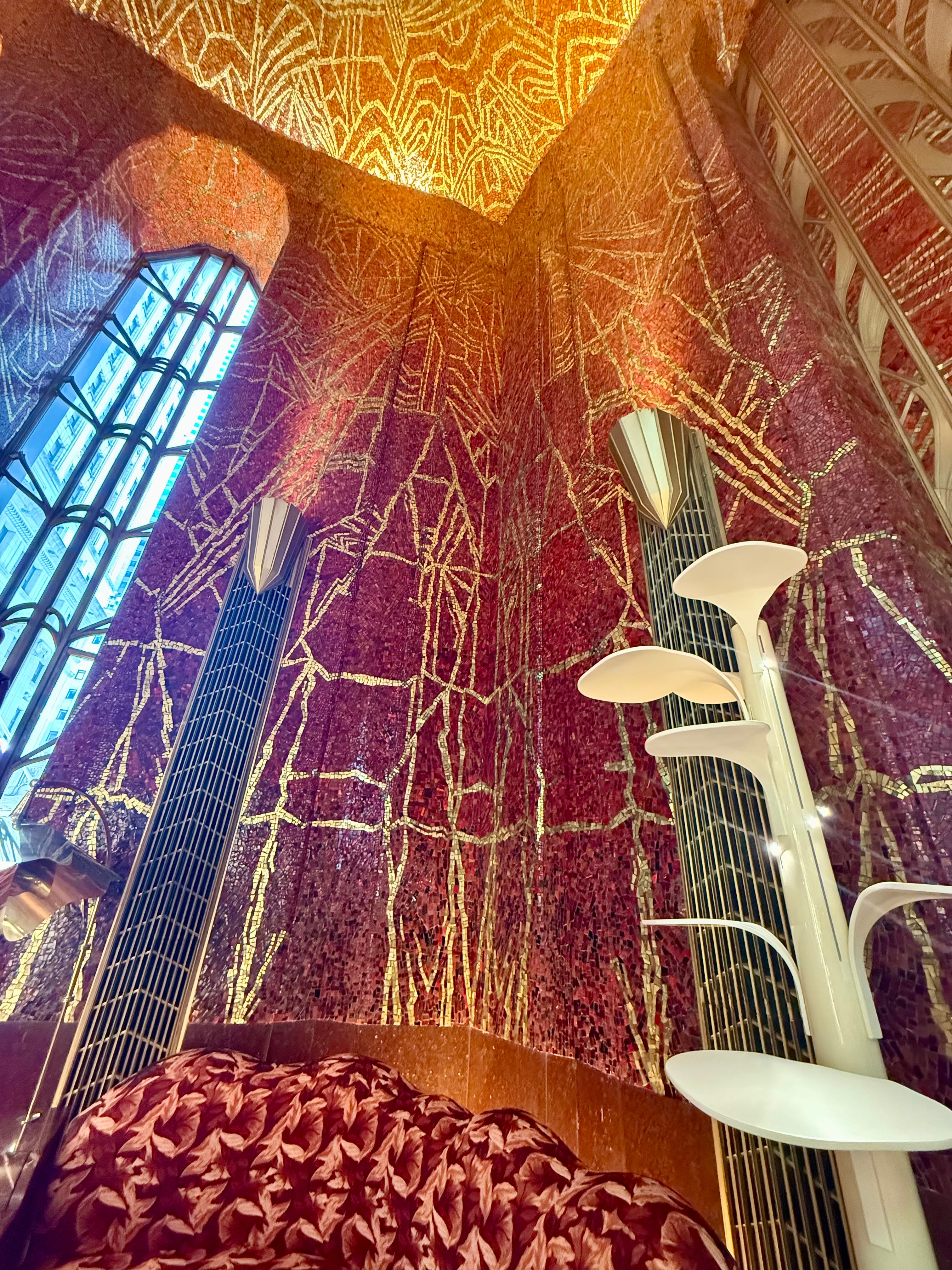 The Red Room, the interior of which is now a New York City Historic Landmark (in addition to the entire exterior of One Wall Street), was once a reception area for the Irving Trust customers. Because this was a private bank, most people would not have been able to enter, and the room was designed to impress its wealthy customers. There would have been no tellers, just some chairs and desks. The Red Room has ceiling heights varying from 30 to 37 feet, and the entire room is 100 by 40 feet. Walker and his associate Perry Coke Smith planned the decor of the room, with artist Hildreth Meière hired as a color consultant. The floor is covered in red terrazzo tiles created in Berlin under the supervision of Walker and Smith. The color scheme of the wall mosaic is red-on-blue which gradually gets lighter as it goes up to draw the eye to the gold-on-black on the ceiling.