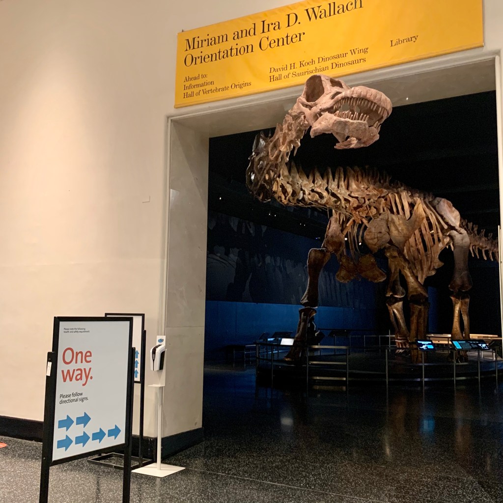 My next visit was to the American Museum of Natural History. Without realizing it, I went on the first day that it was open to the public (after a members’ preview) and they were giving out souvenir casts of a t-rex tooth as a welcome gift. This was surprisingly thrilling! Reservations were required in advance (here), masks required, temperature was checked as you entered, hand sanitizer was abundant, and I found the signage more explicit and clear here than in any other museum. This makes sense, as their demographic includes many younger visitors. Even the restrooms blocked off every other stall and every other sink to encourage distance – although when I was in there, I was alone so that wasn’t an issue.